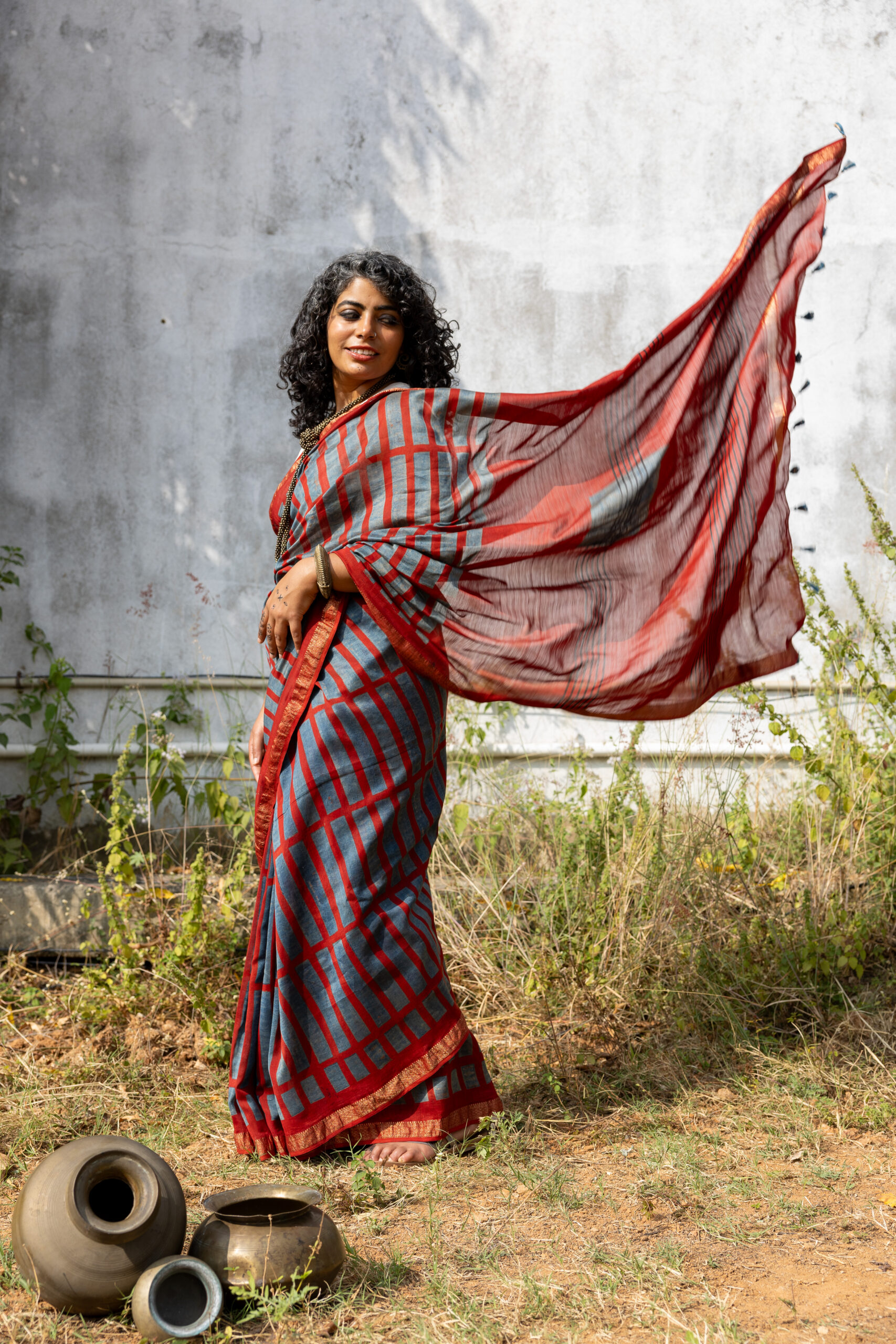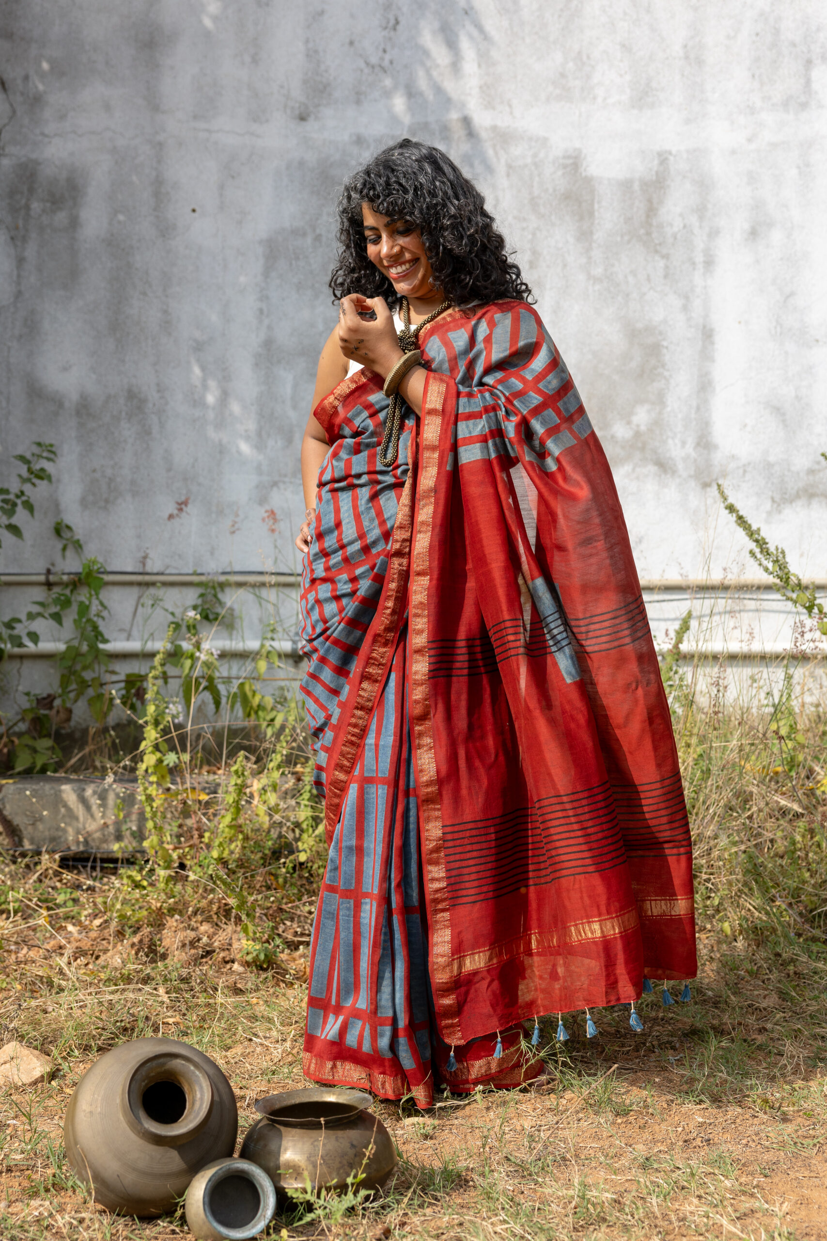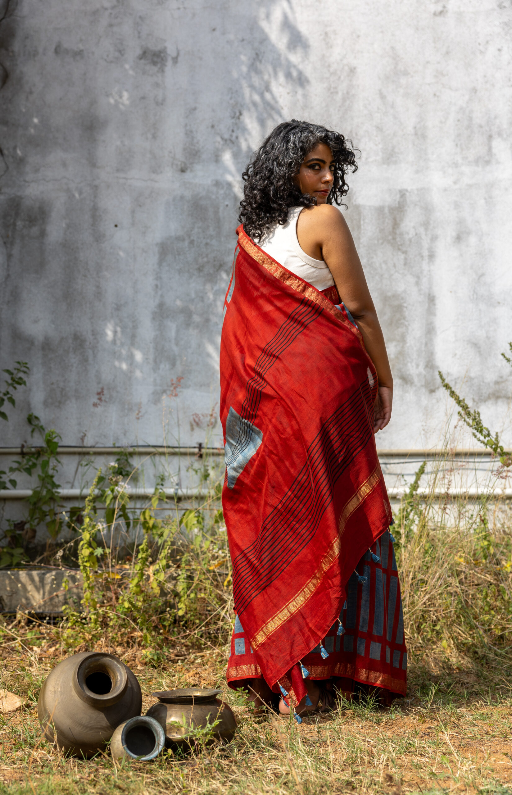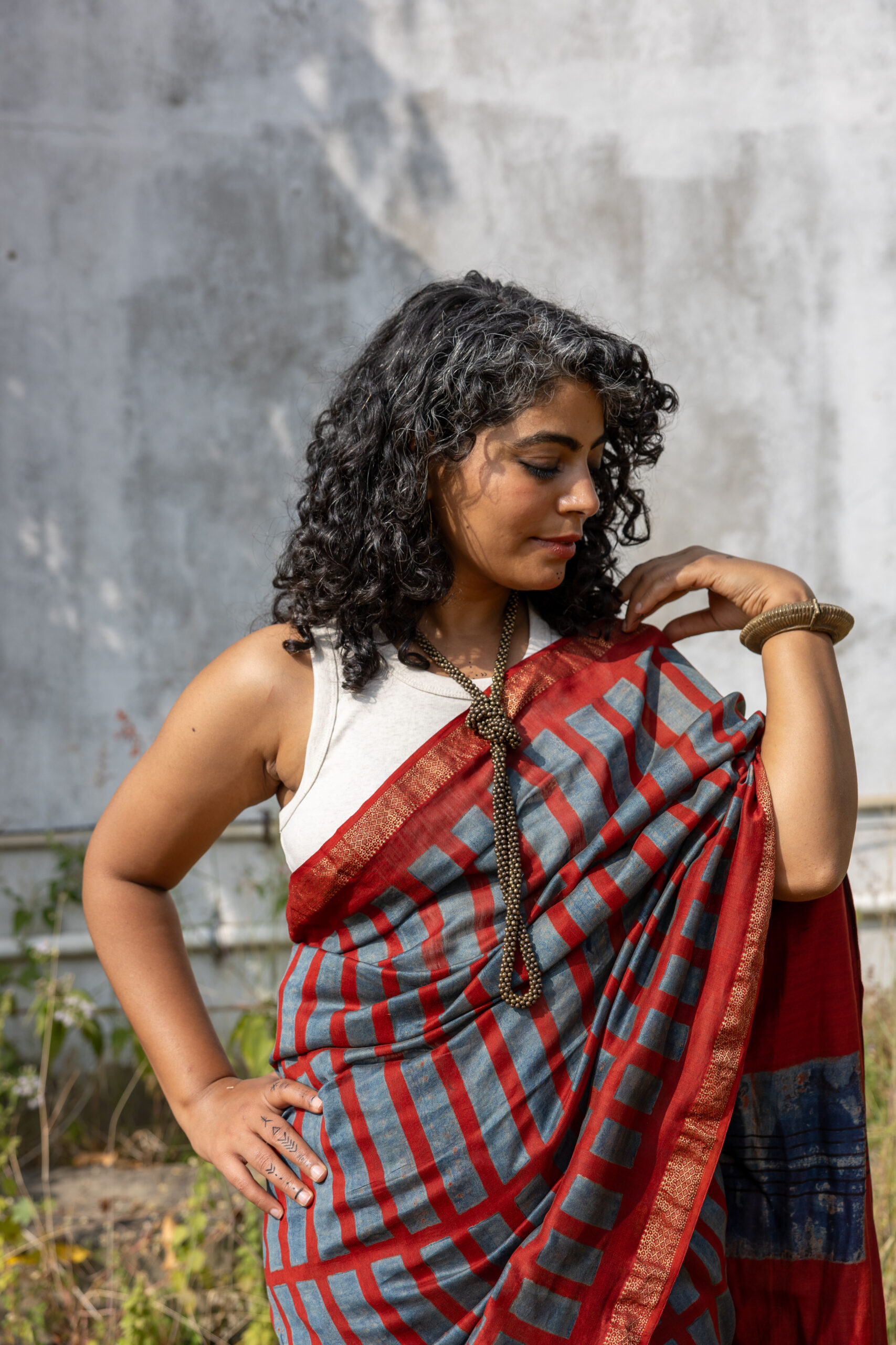 Ajrakh on Handwoven Maheshwari: Red indigo