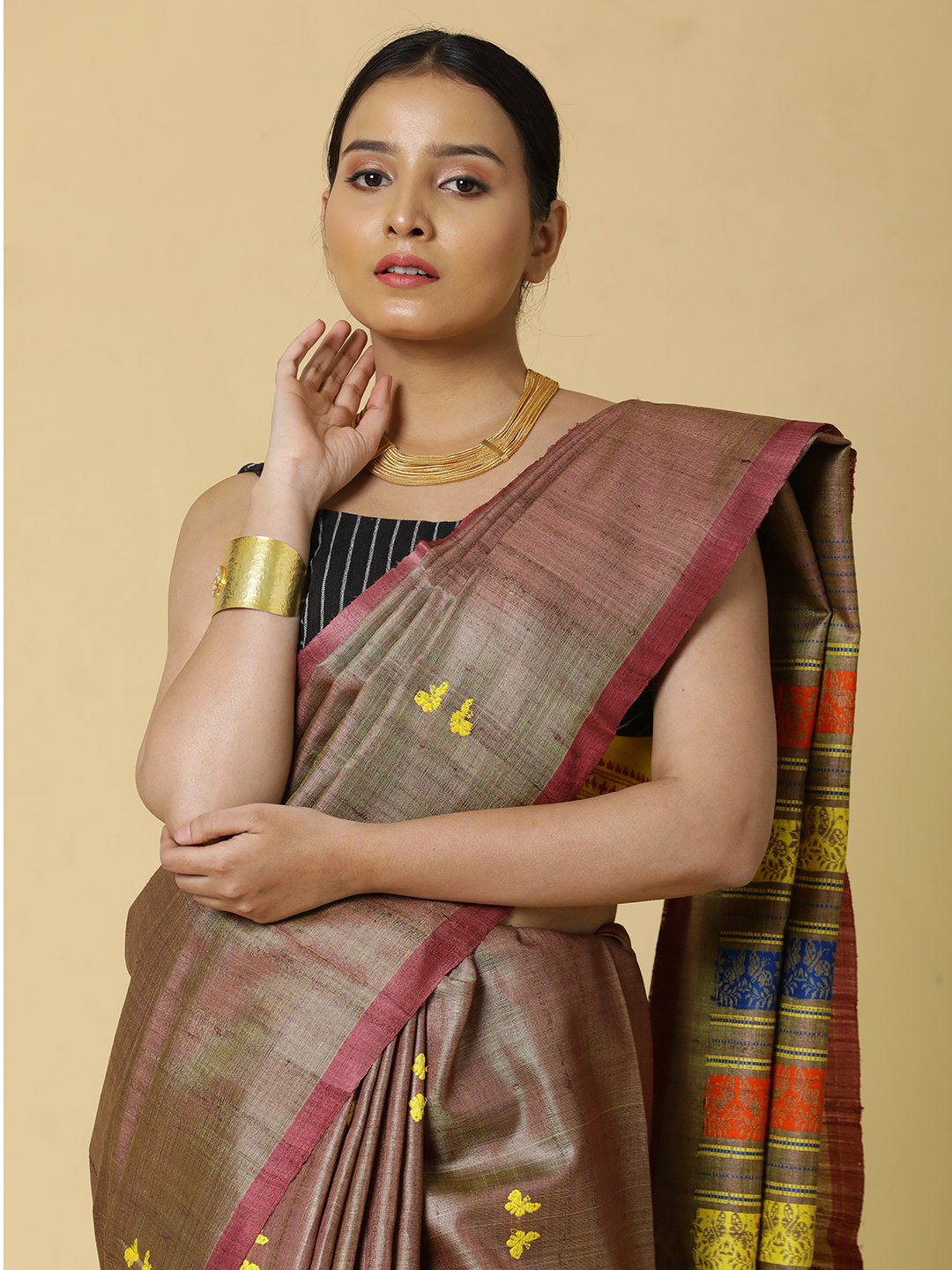 The warm earth tone, intermittently woven in brown and yellow, evoking subtle lustre.The true magic of this saree lies in its exquisite butterfly motif. Delicate, handwoven butterflies seem to flutter across the fabric, rendered in intricate detail.