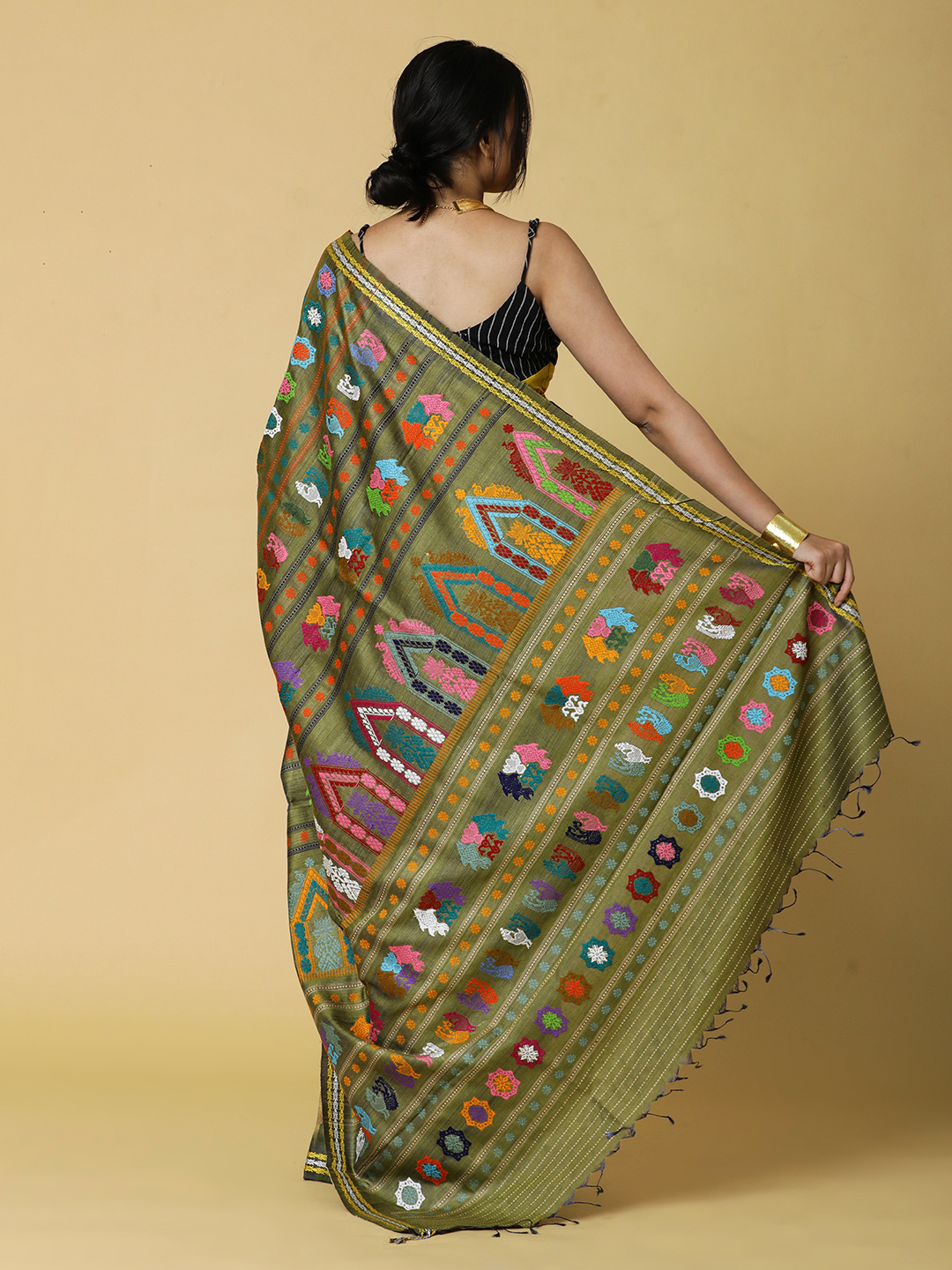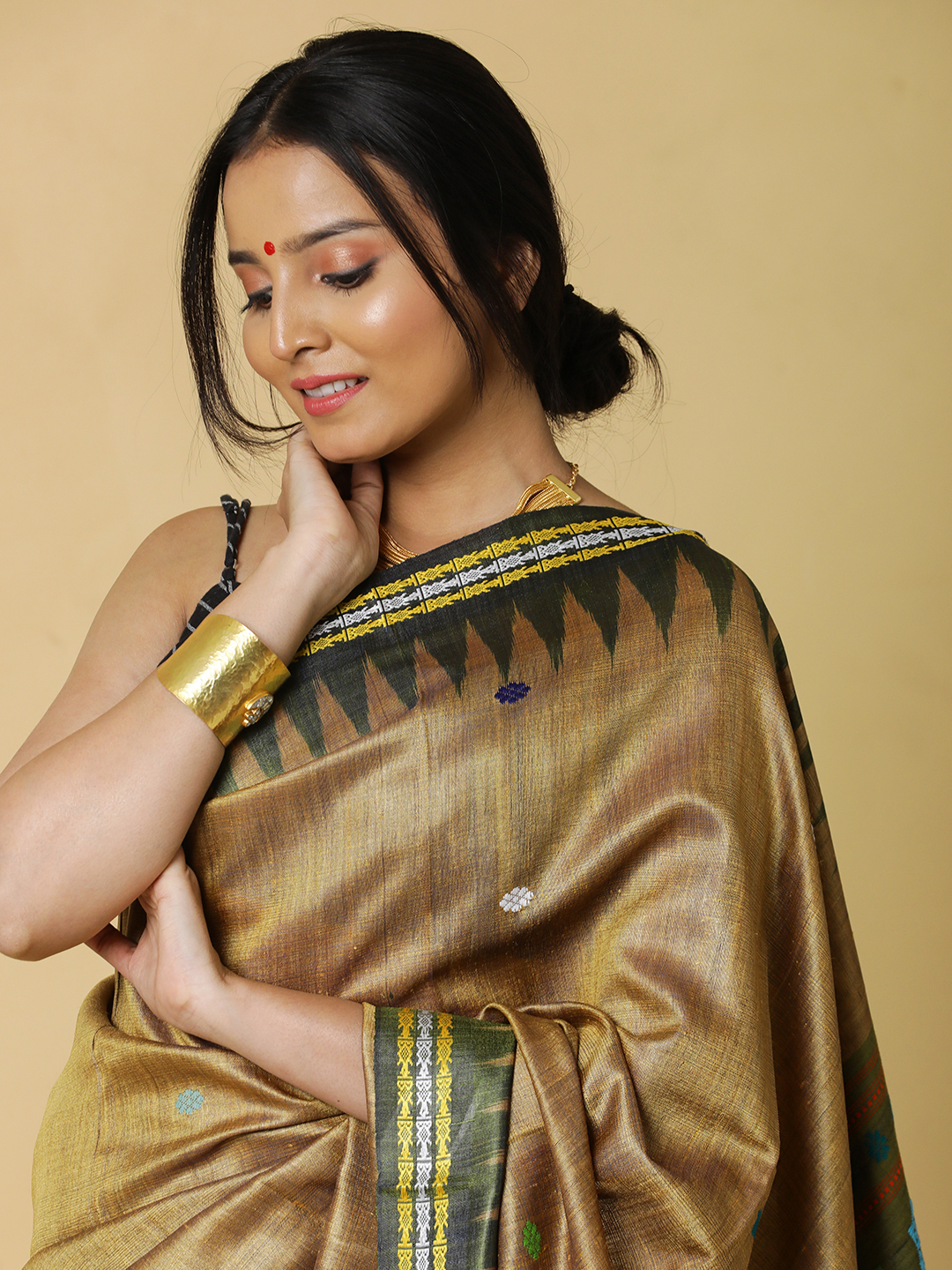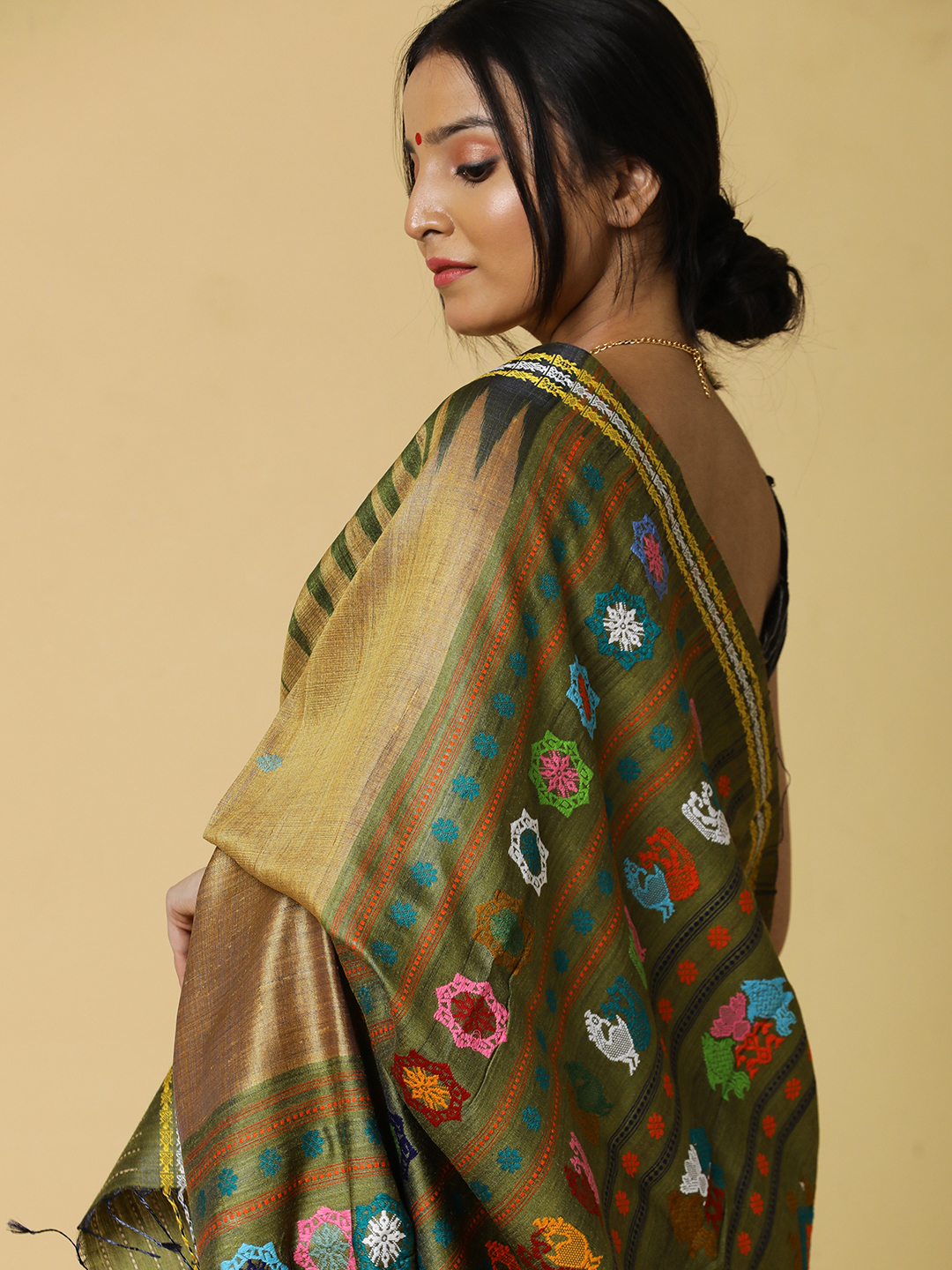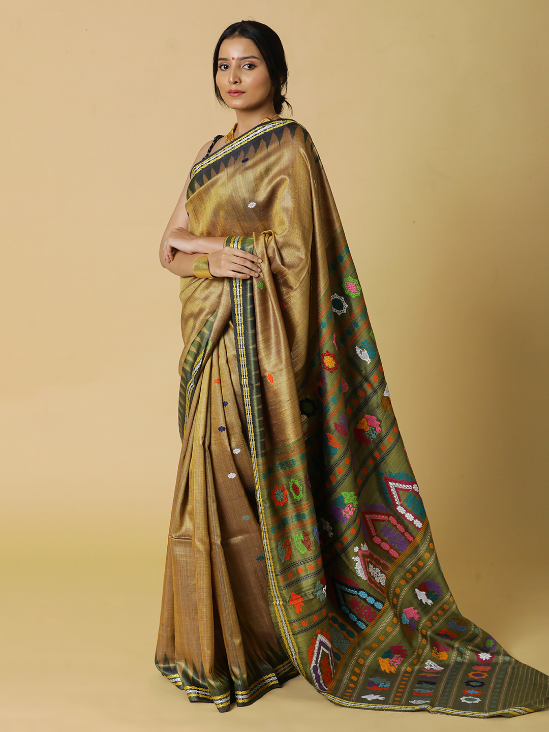 Earthy Brown with Moss green kumbha border pure tussar dolabedi, where the intricacies of the woven pallu tells a thousand stories of the culture of the region. Pair it with some silver jewellery for a stunning look.