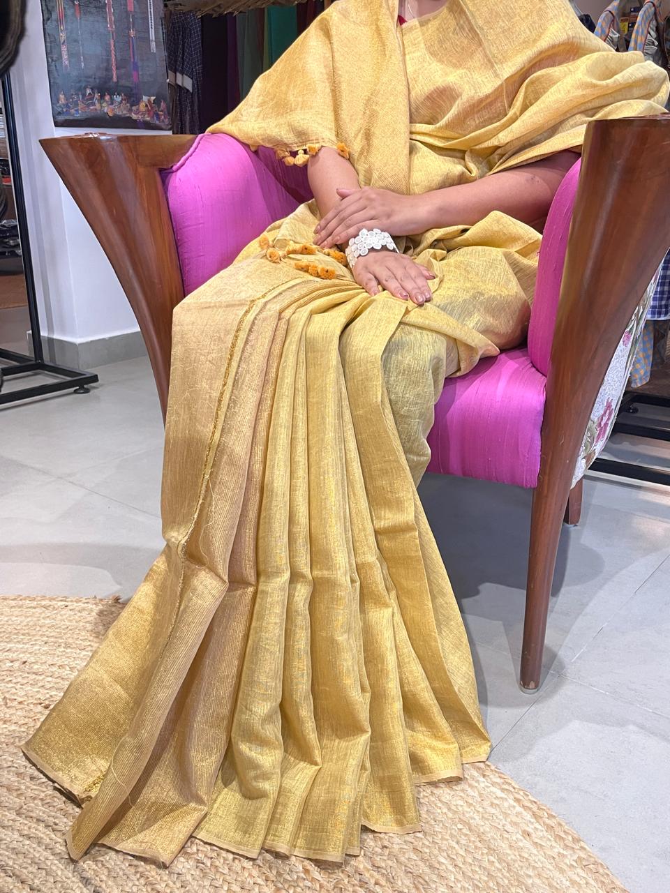 fuchsia pink and yellow stripes saree with neon green satin border handwoven saree in organza base from West Bengal. Perfect wear for a festive occasion or wedding ceremony.