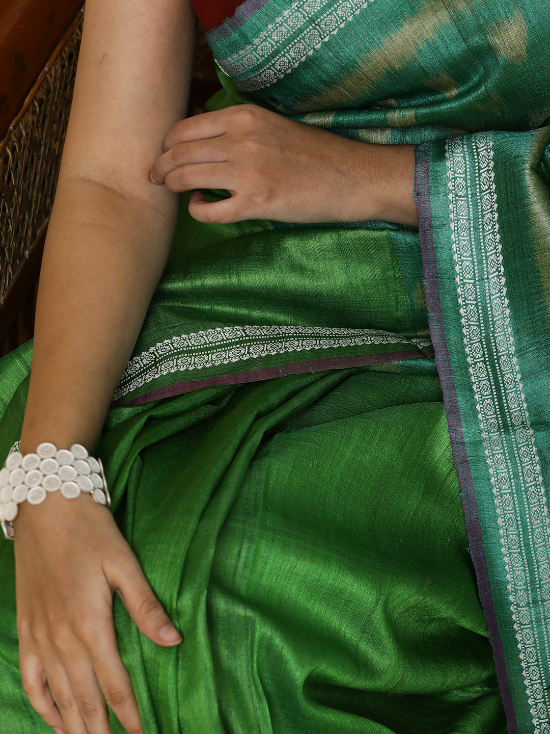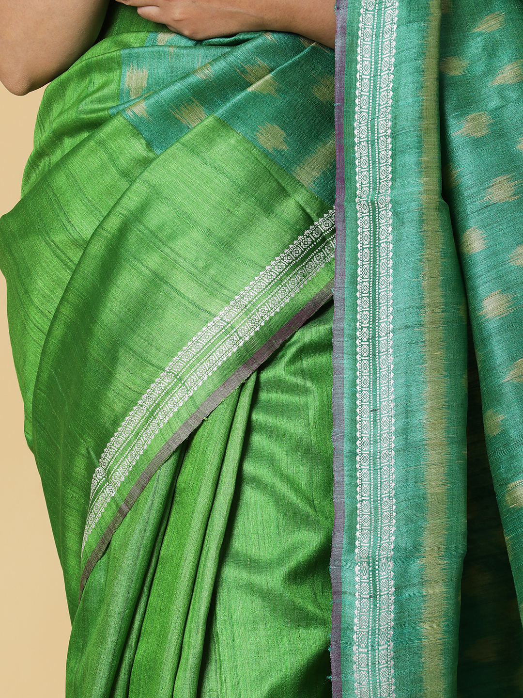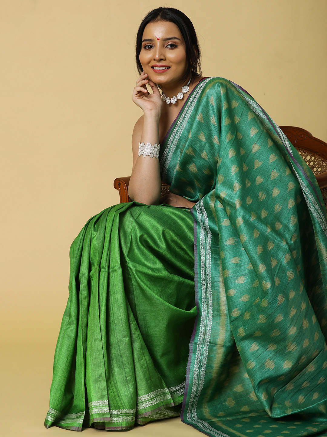Green Double Ikat Pure Tussar Silk with intricate Flower Buta motif in white, Contrasting colour combination and delicate motifs make this a collectors piece.