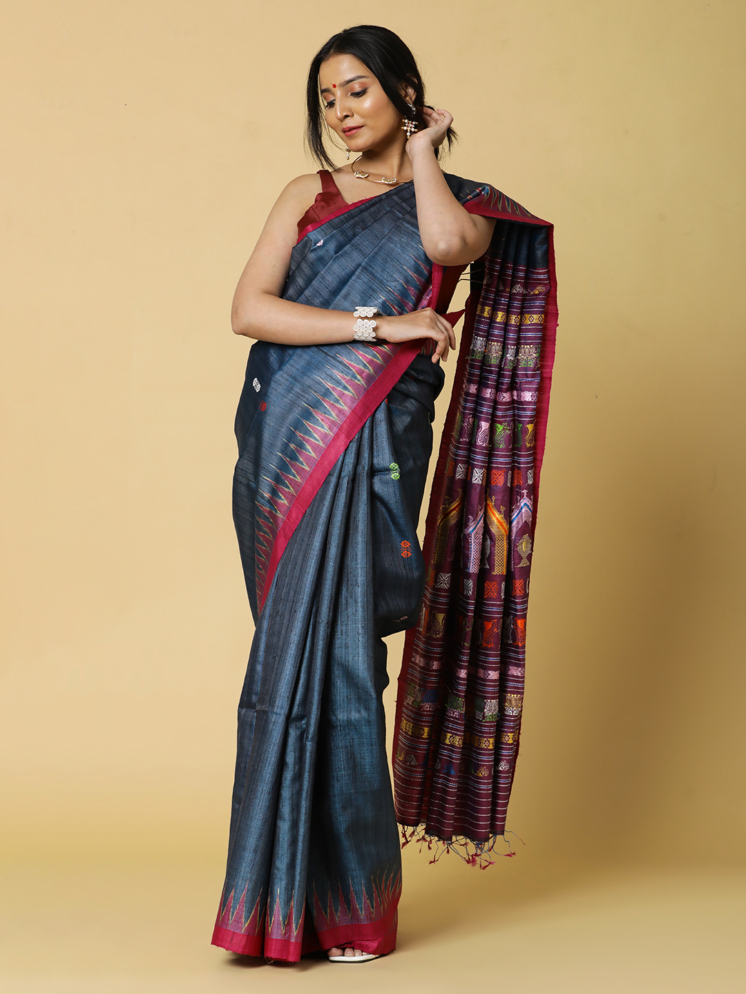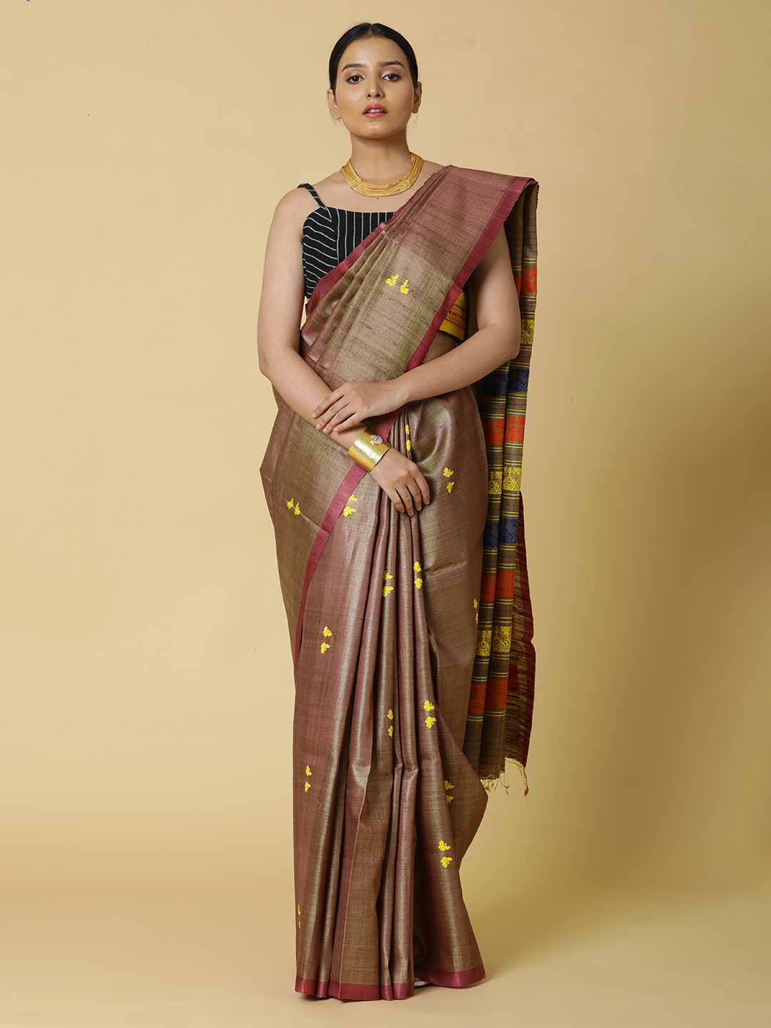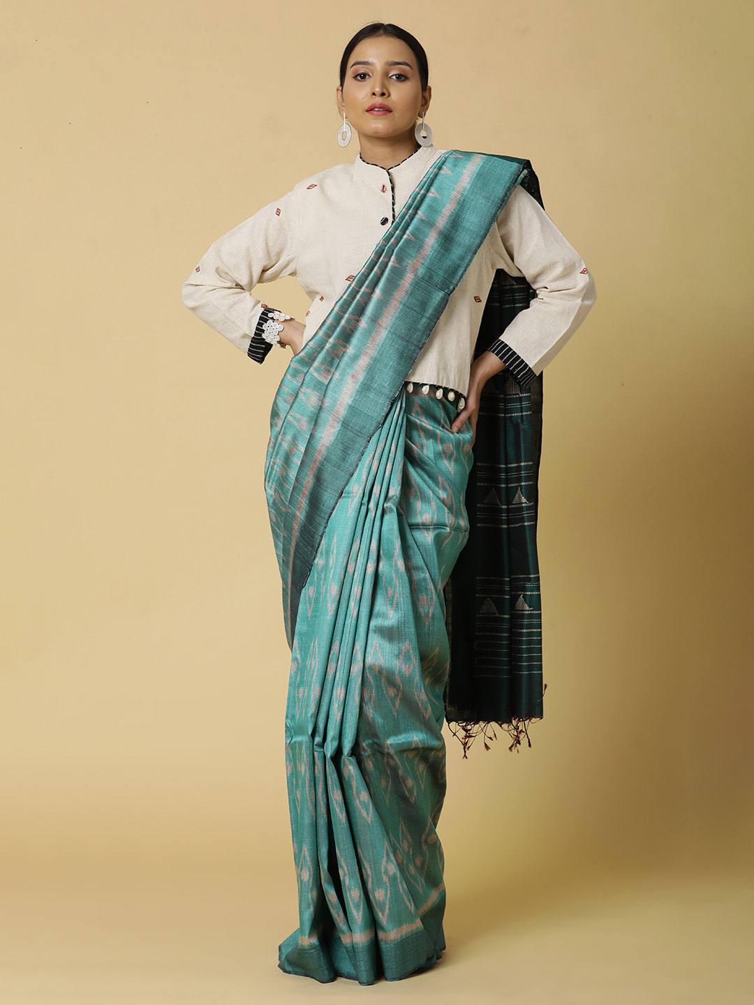 Green Double Ikat Pure Tussar Silk with intricate Flower Buta motif in white, Contrasting colour combination and delicate motifs make this a collectors piece.