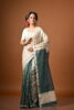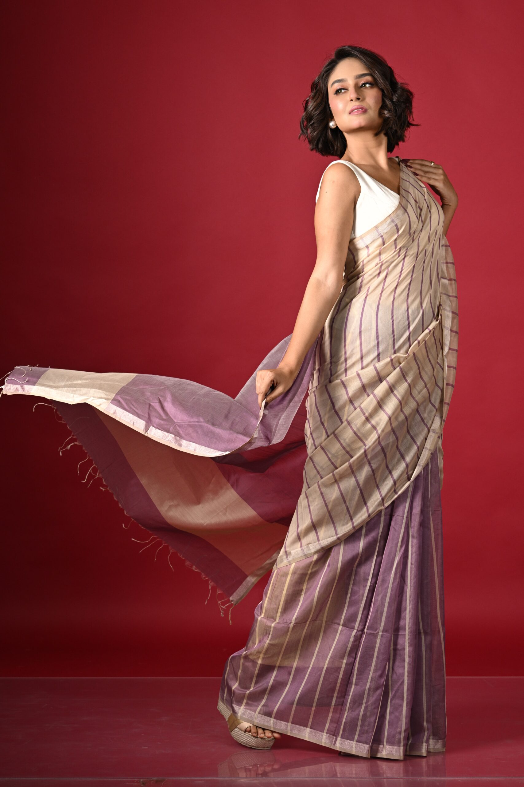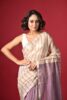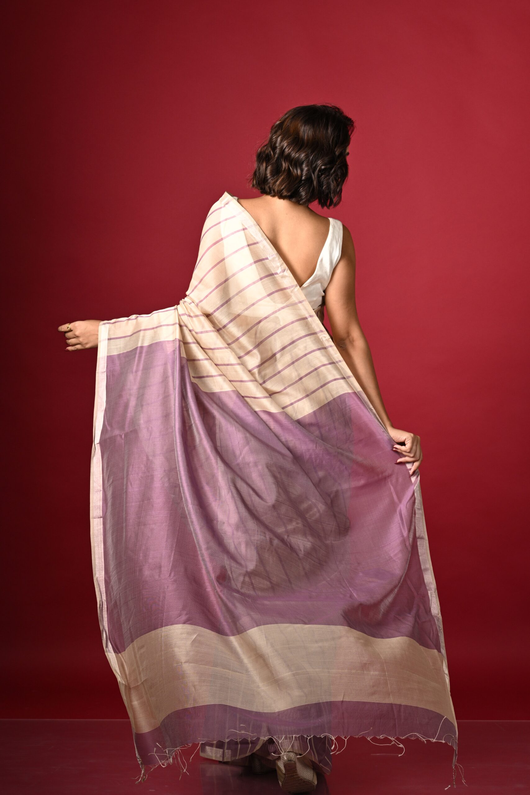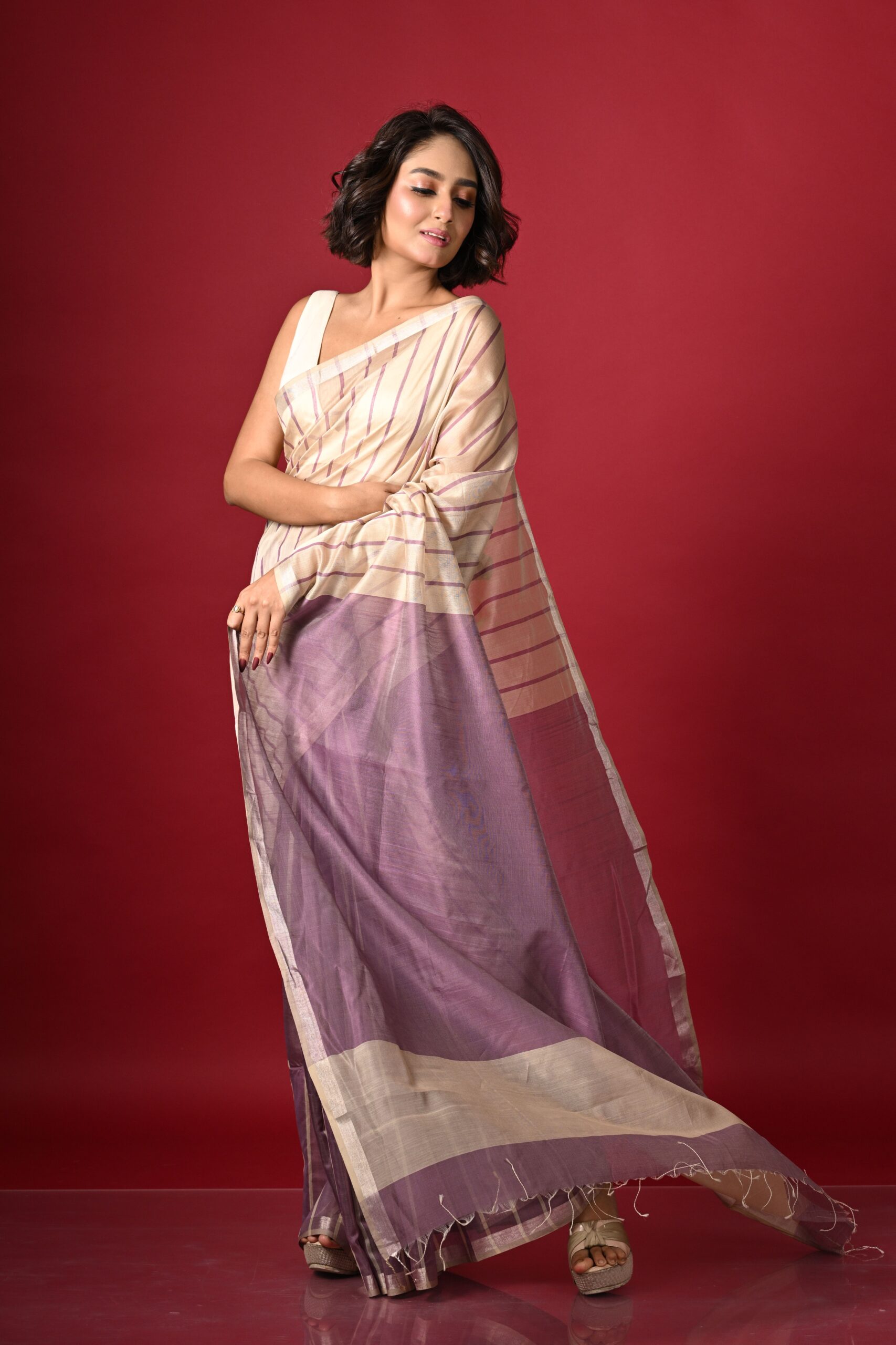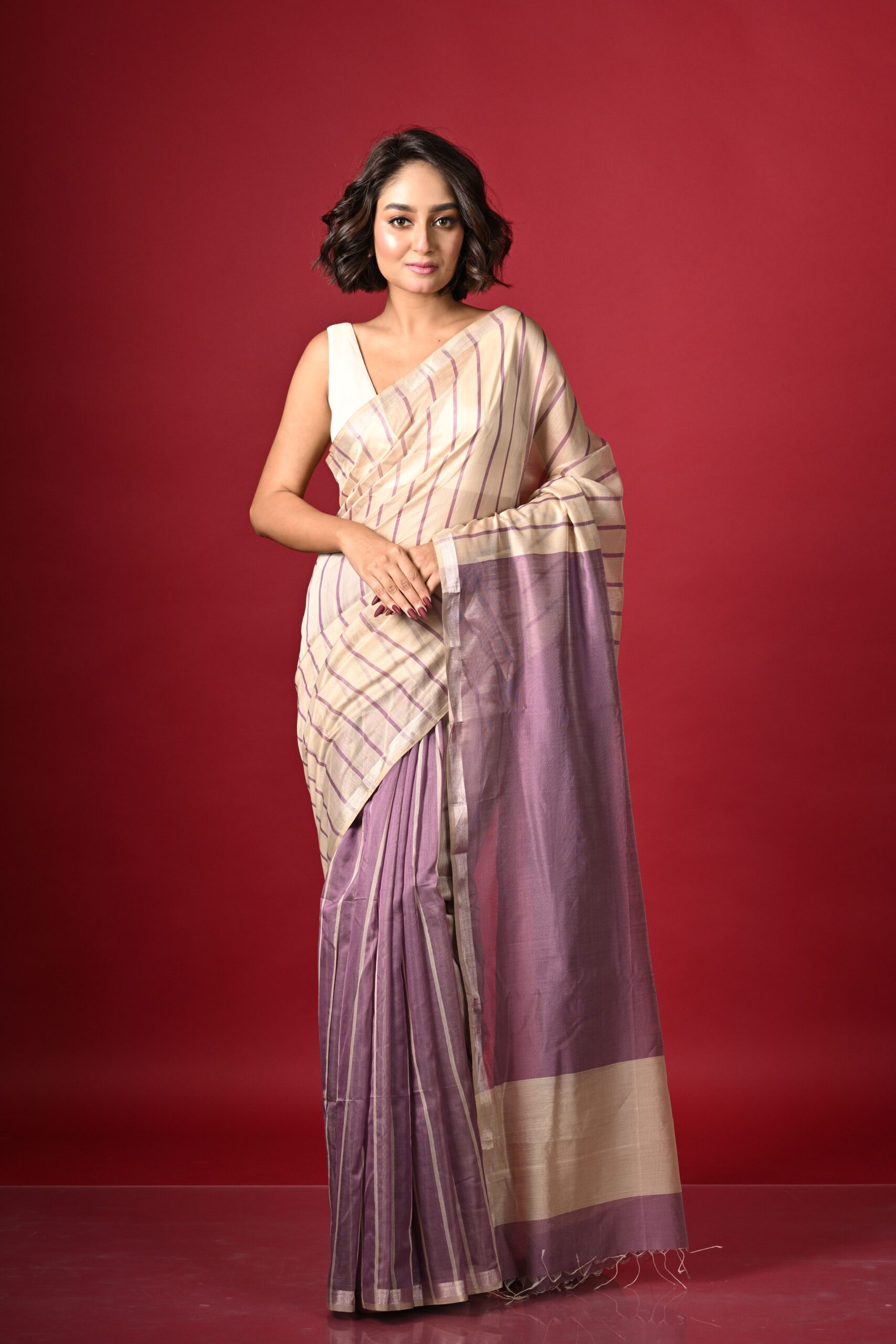 Introducing our elegant silk cotton saree, a tribute to the rich weaving heritage of Maheshwar, Madhya Pradesh. This saree is divided into three sections: the first, up to the pleats, features a lilac base with thin ivory stripes.