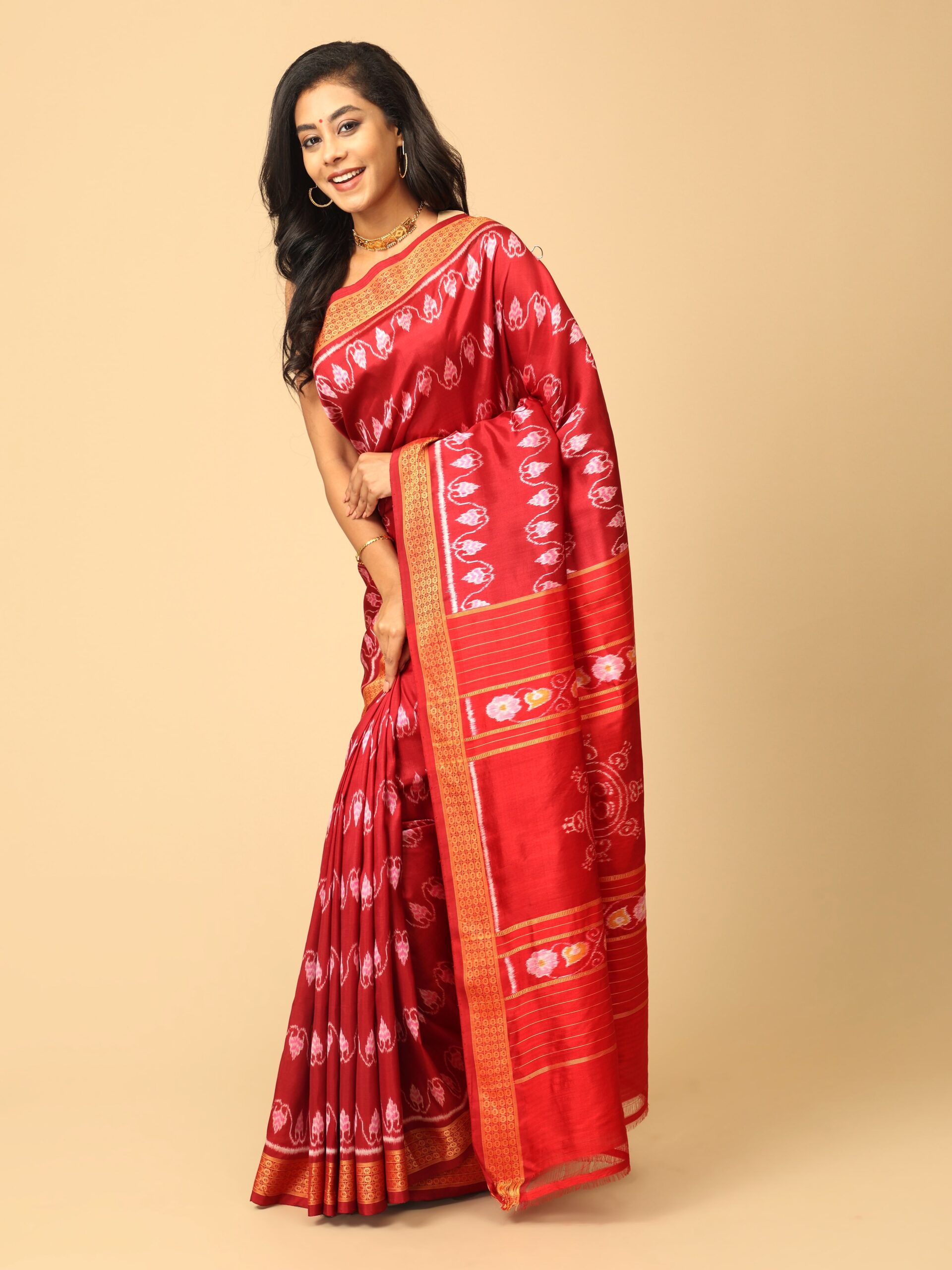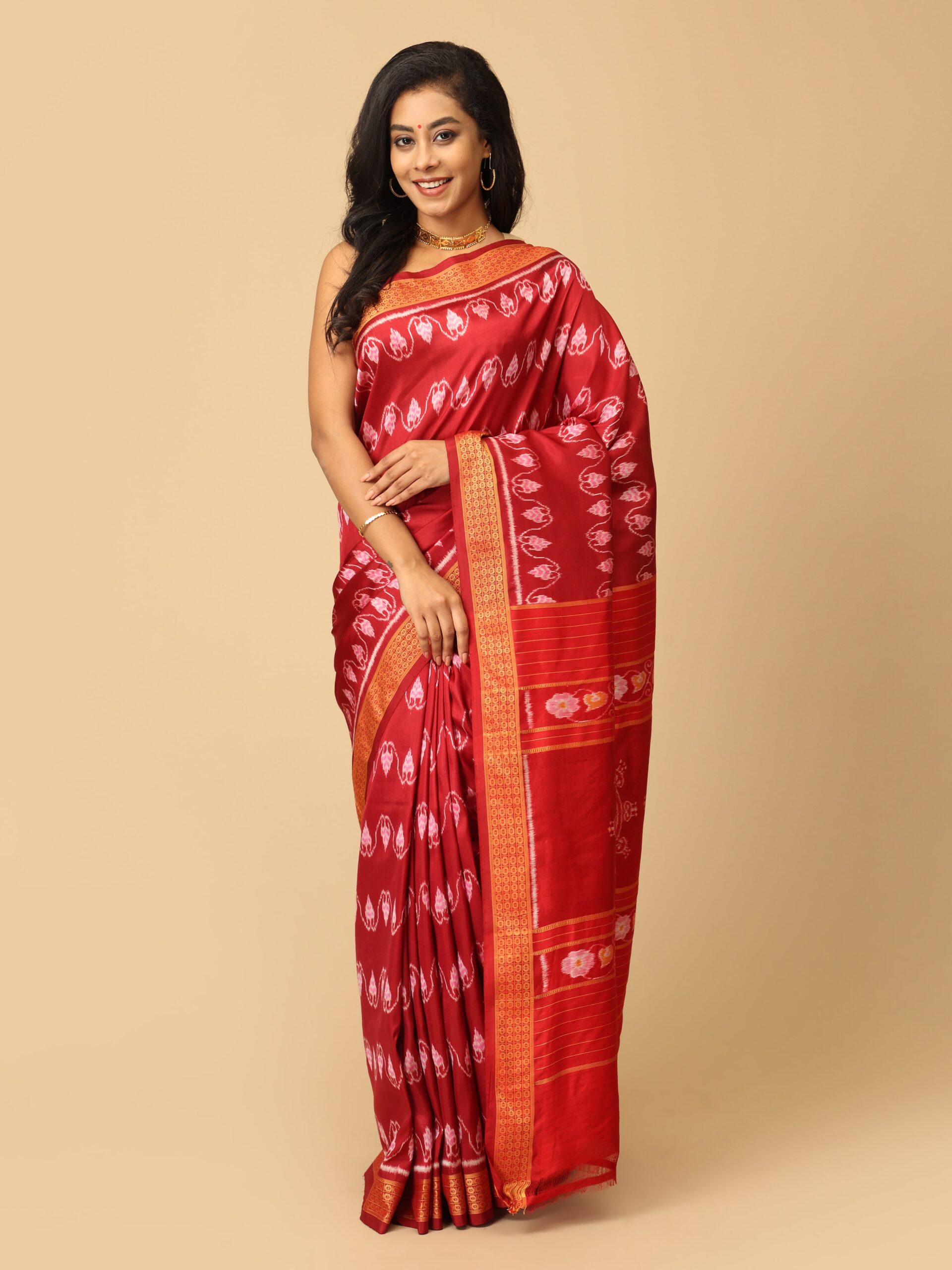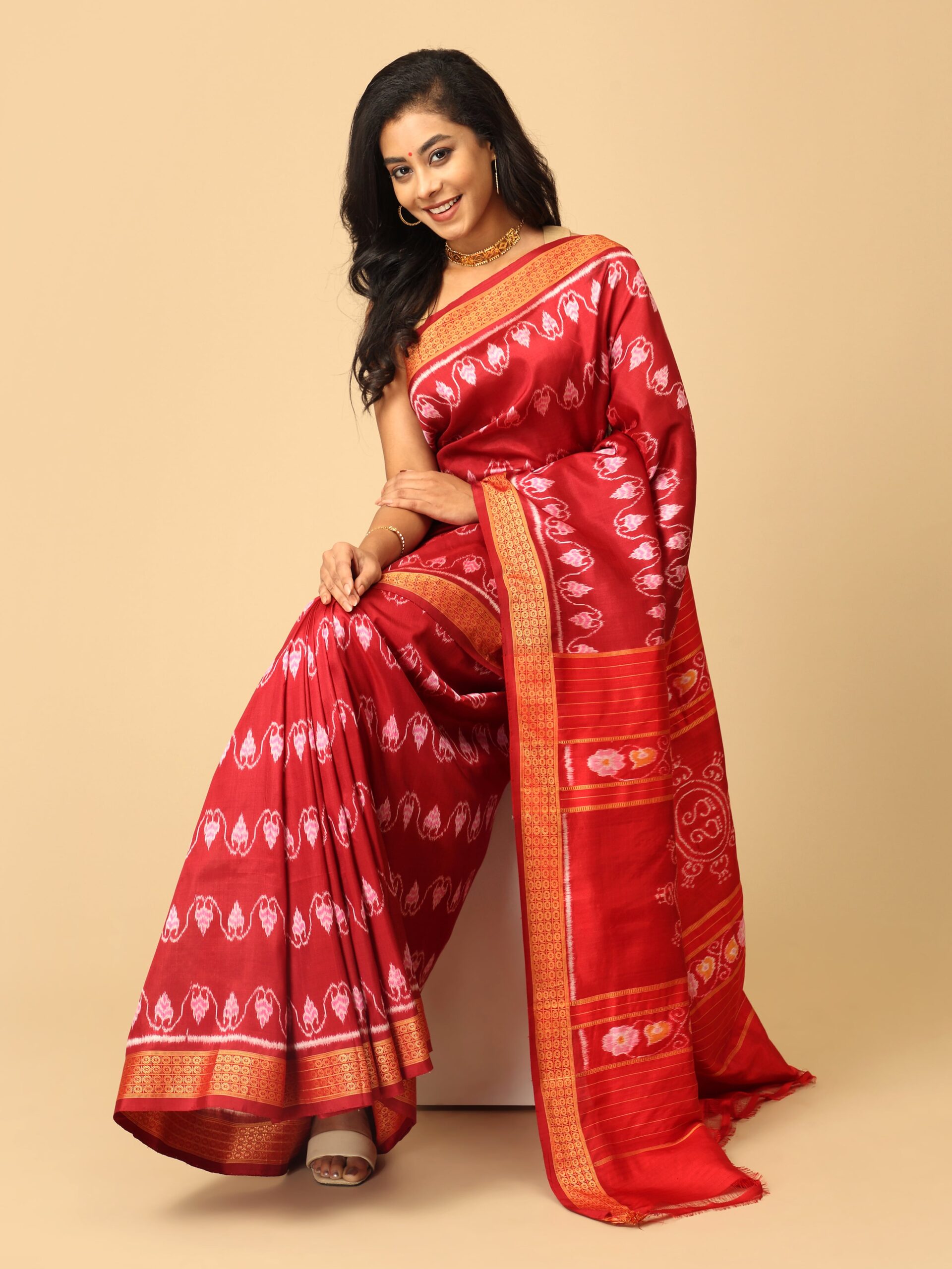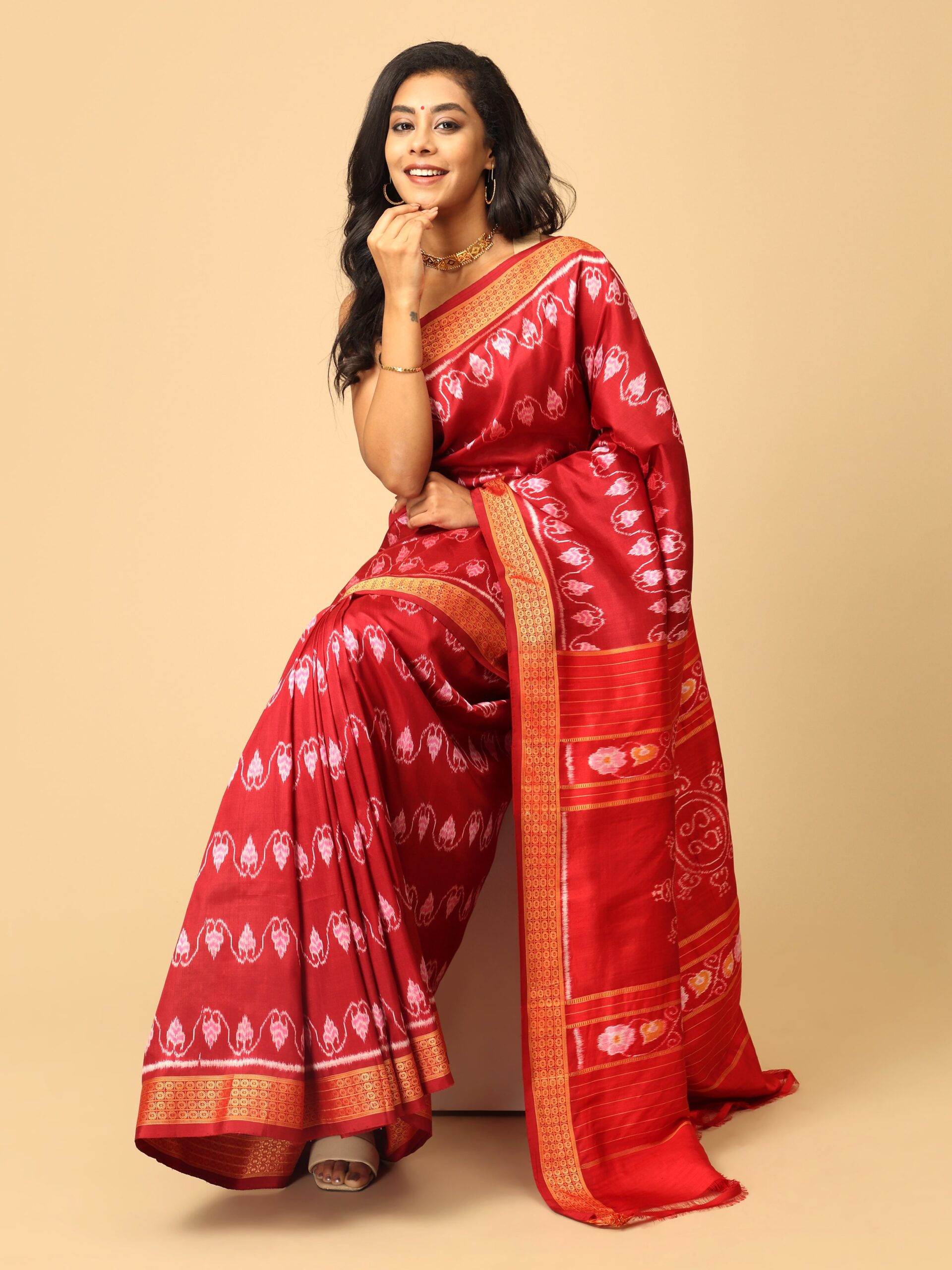 All the shades of Red in this beautiful Maniabandha Silk Saree with Lakshmi motif in the pallu. The weaves of Maniabandha and Nuapatna in Odisha are made in pitlooms with silk or cotton using the ikat technique which involves tie-dying the yarn before weaving. The motifs are symbolic each telling a story of the regions culture and history