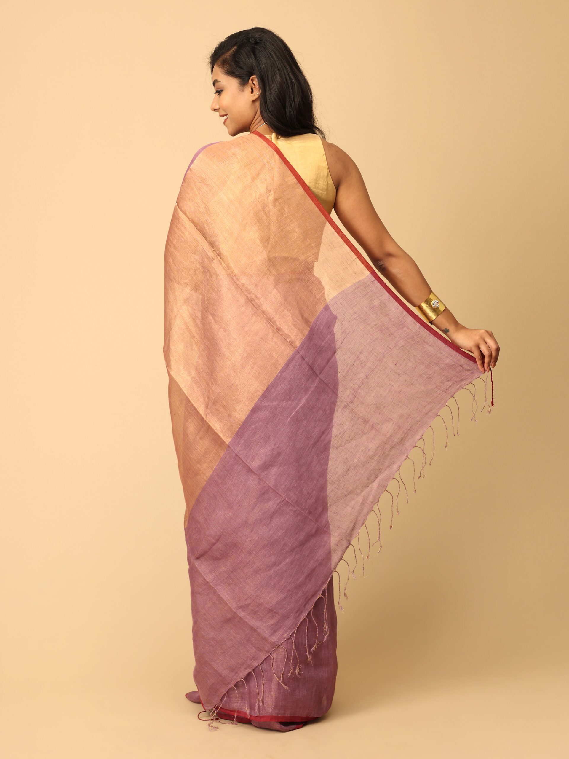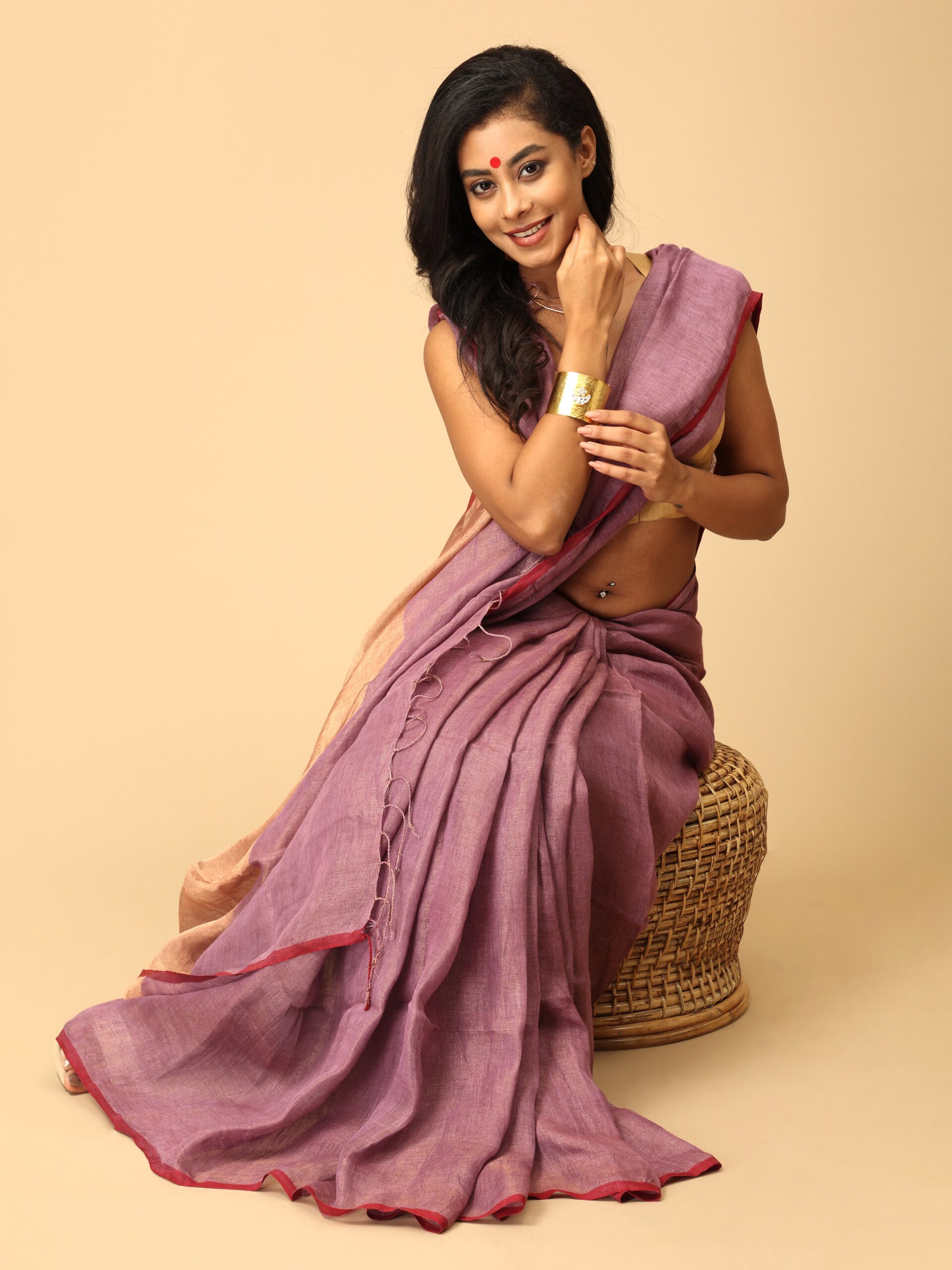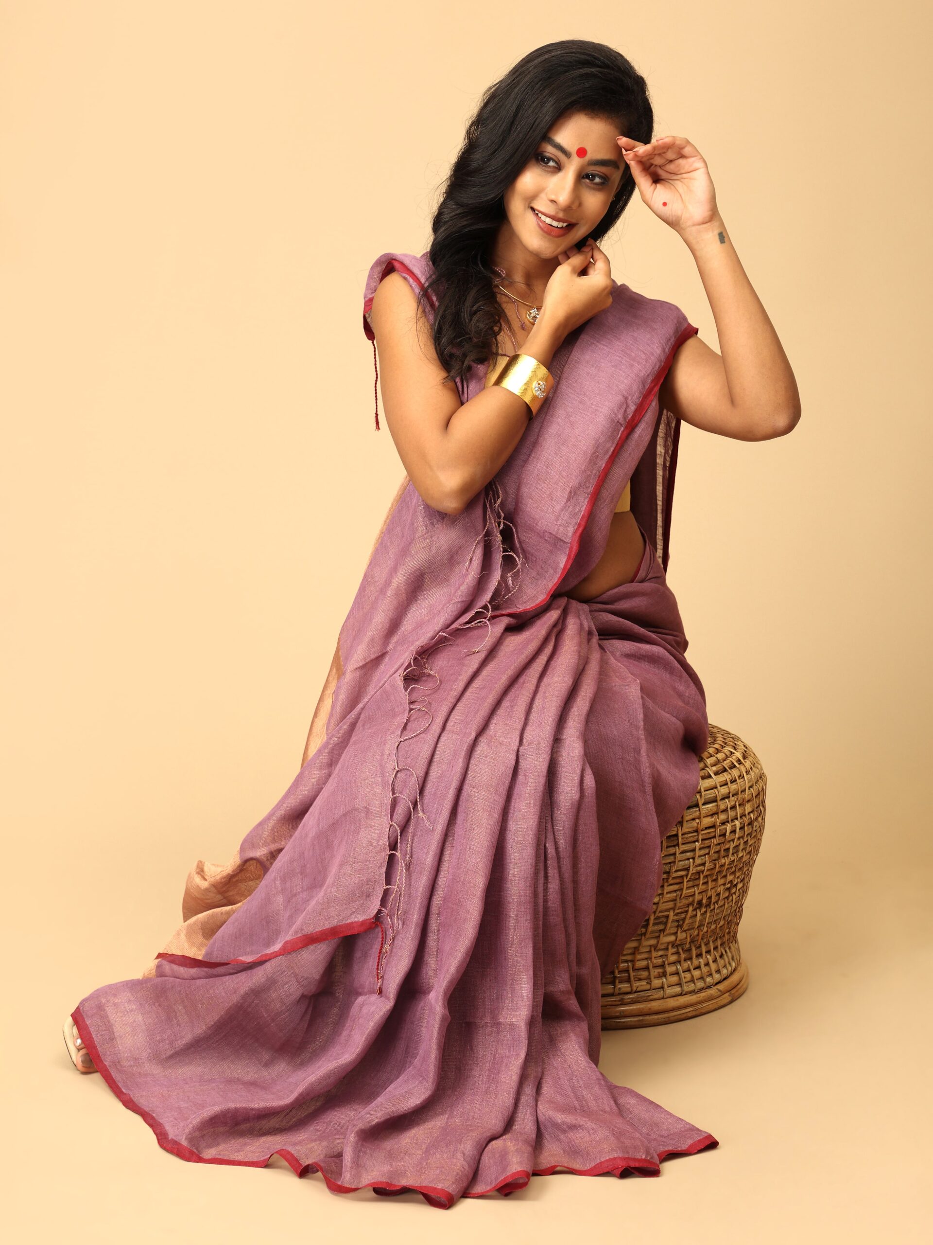 Linen and Zari Saree in mauve and red border. The lightweight linen fabric from West Bengal drapes gracefully, while intricate zari work, often in gold or silver, adds a touch of opulence with traditional motifs. These sarees are perfect for both festive occasions and casual wear.