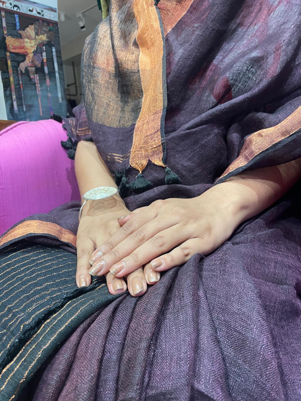 Drape yourself in timeless elegance with this handcrafted linen saree. Woven with exquisite zari work, it exudes a subtle sheen that adds sophistication to your look. The pallu is beautifully adorned with delicate tassels, giving it a charming finish. Lightweight and breathable, this saree is perfect for festive occasions, intimate gatherings, or effortless everyday grace. Fabric - linen cotton Colour - chocolate Length- 6 meters with blouse