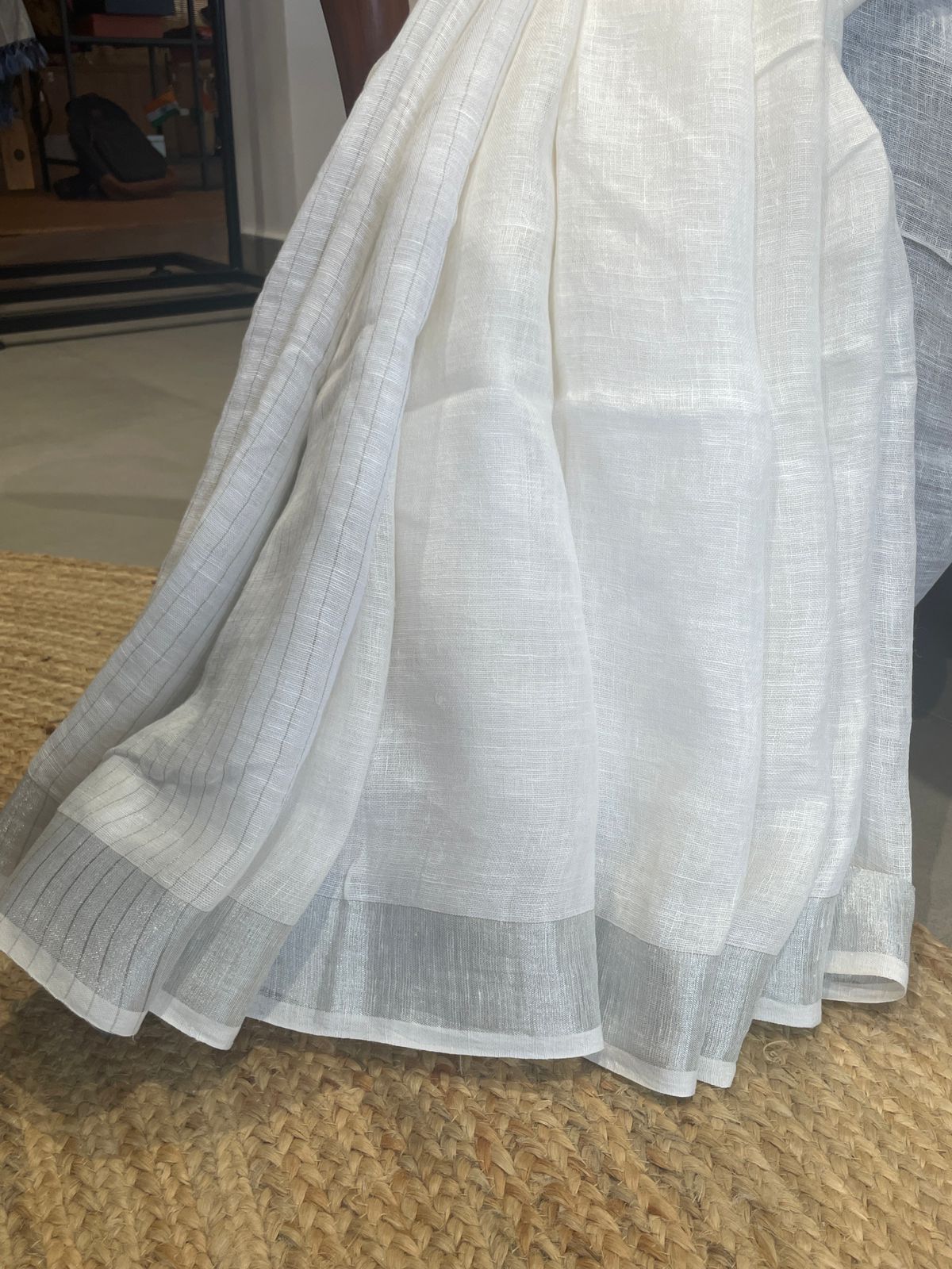 Drape yourself in timeless elegance with this handcrafted linen saree. Woven with exquisite zari work, it exudes a subtle sheen that adds sophistication to your look. The pallu is beautifully adorned with delicate tassels, giving it a charming finish. Lightweight and breathable, this saree is perfect for festive occasions, intimate gatherings, or effortless everyday grace.