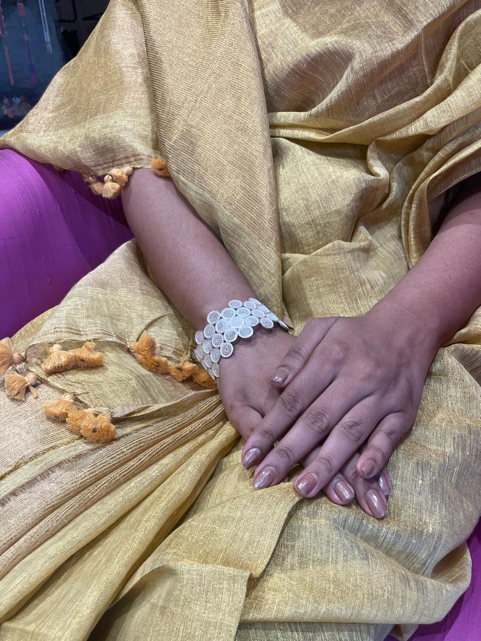 Drape yourself in timeless elegance with this handcrafted linen saree. Woven with exquisite zari work, it exudes a subtle sheen that adds sophistication to your look. The pallu is beautifully adorned with delicate tassels, giving it a charming finish. Lightweight and breathable, this saree is perfect for festive occasions, intimate gatherings, or effortless everyday grace.