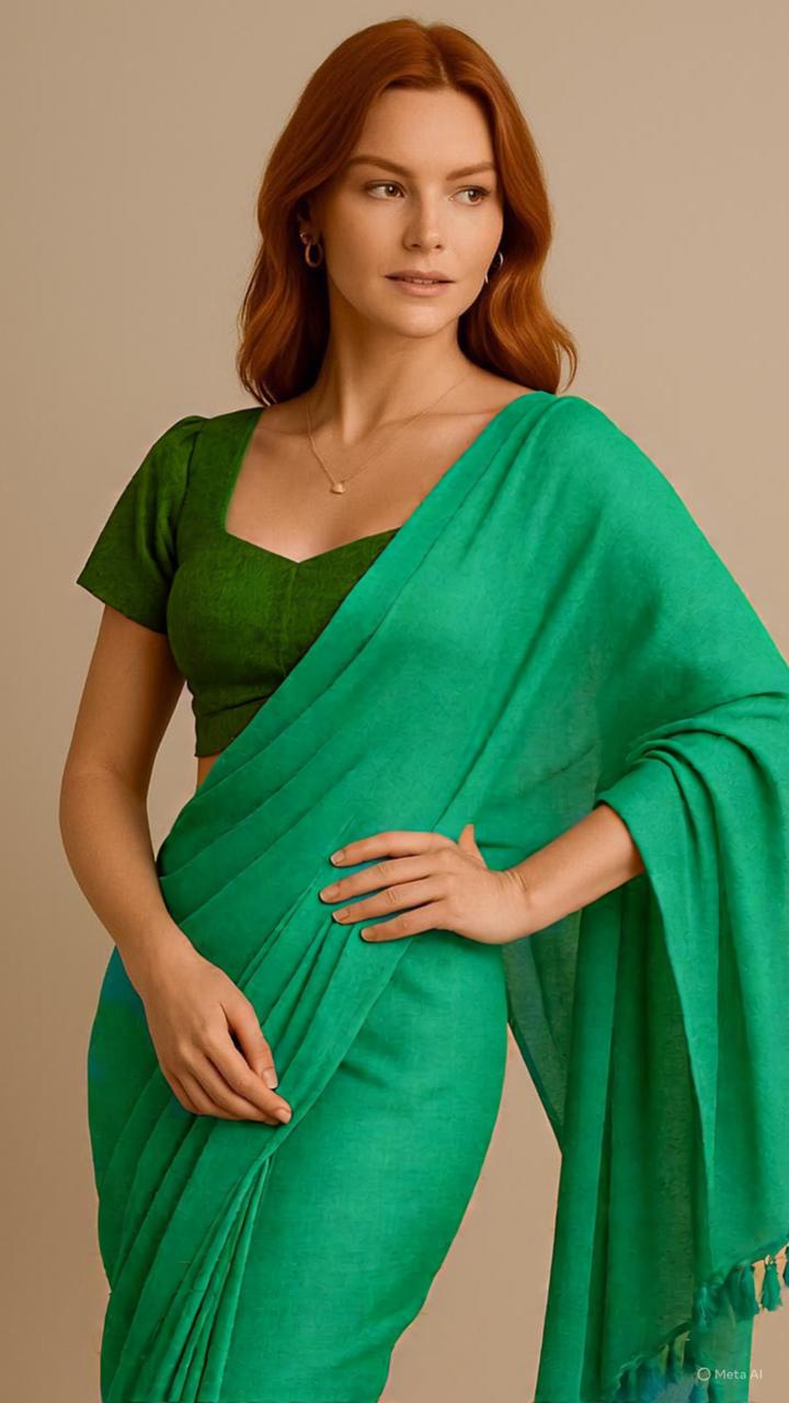 Drape yourself in effortless elegance with this lightweight mul cotton saree. Soft, breathable, and easy to style, this saree is perfect for everyday wear as well as casual outings. The soothing green  hue adds a refreshing charm, while the minimal design makes it versatile to pair with both traditional and contemporary blouses. Finished with delicate tassels on the pallu, it brings together comfort and grace in one beautiful piece.