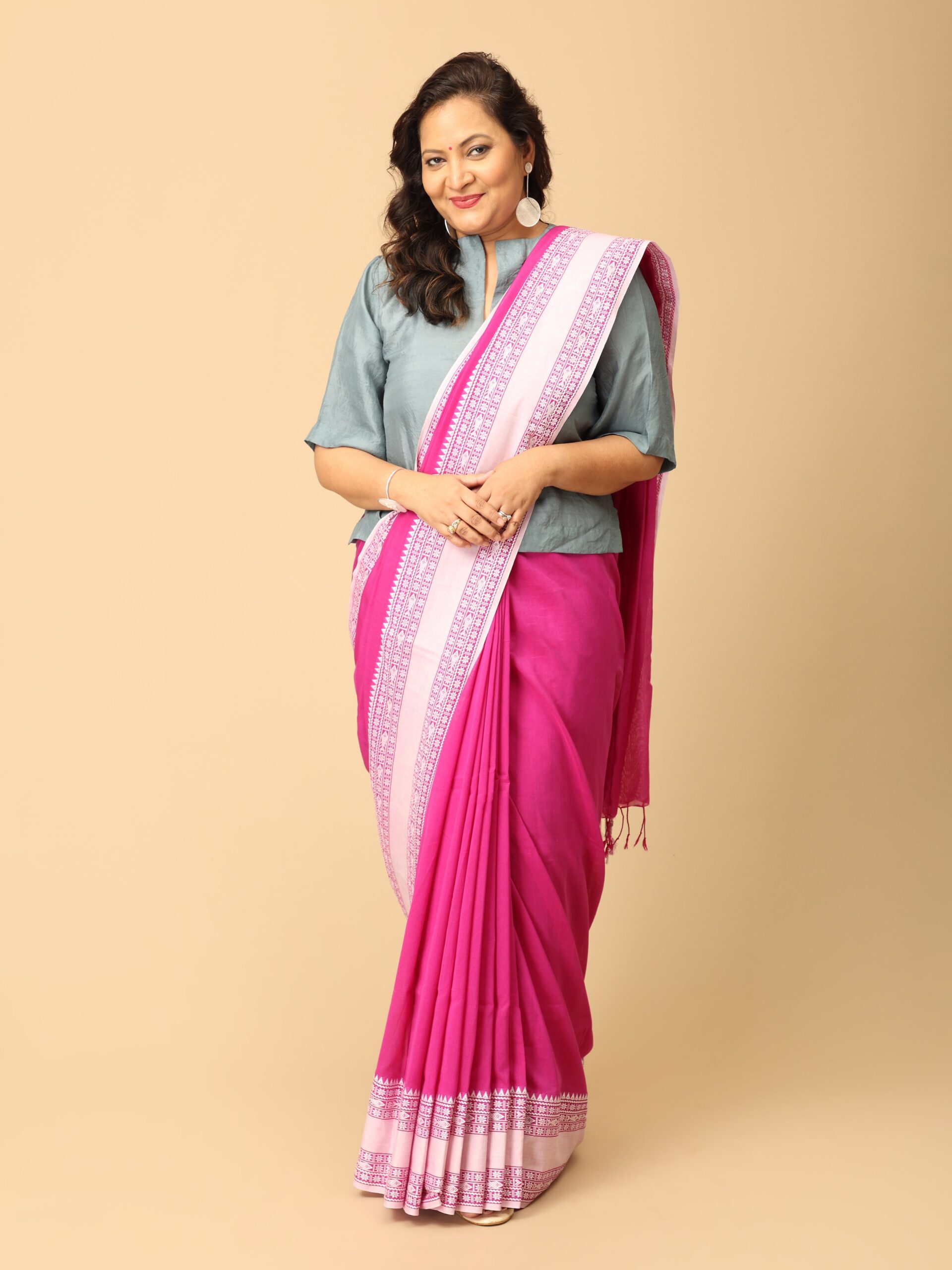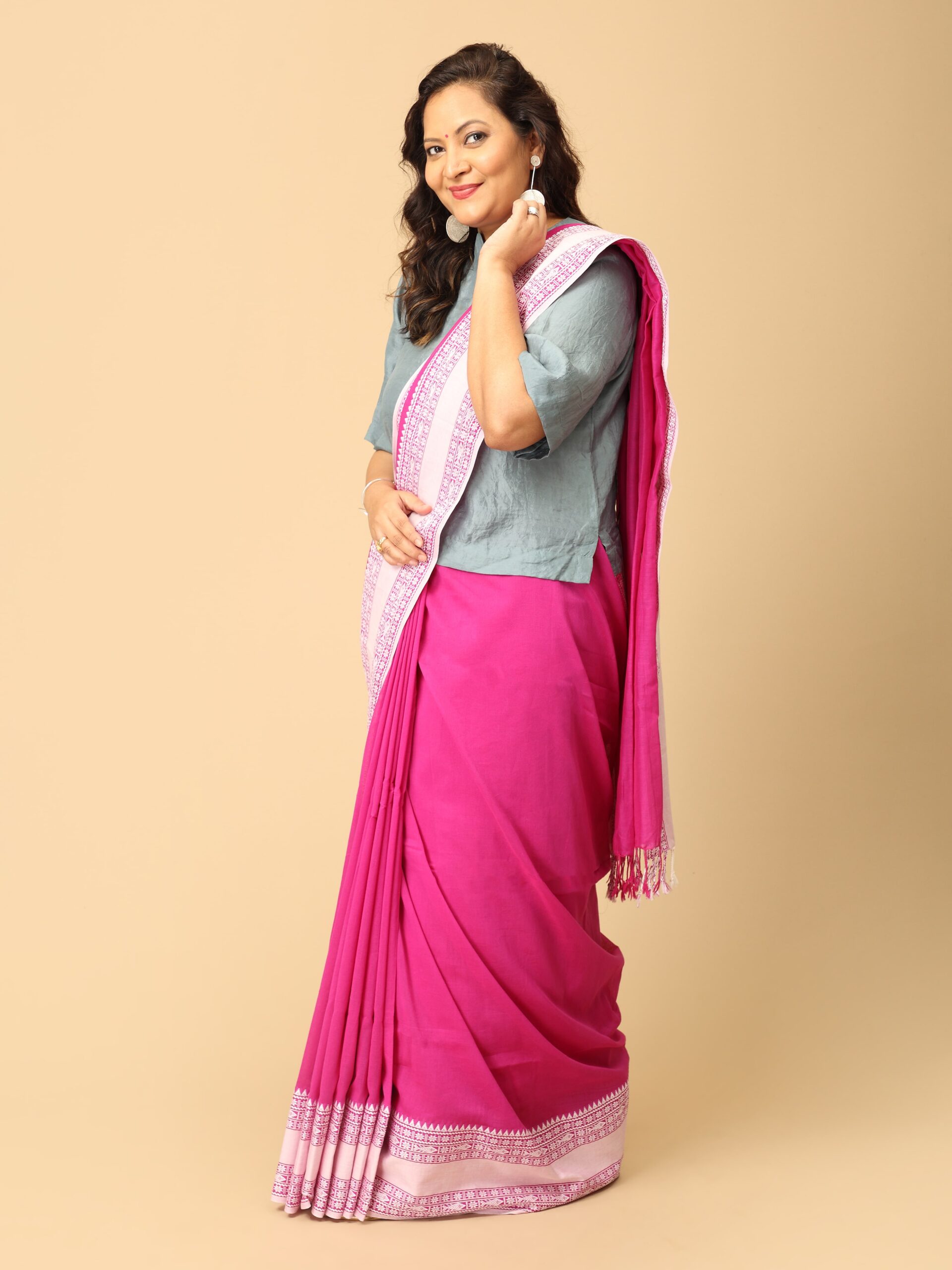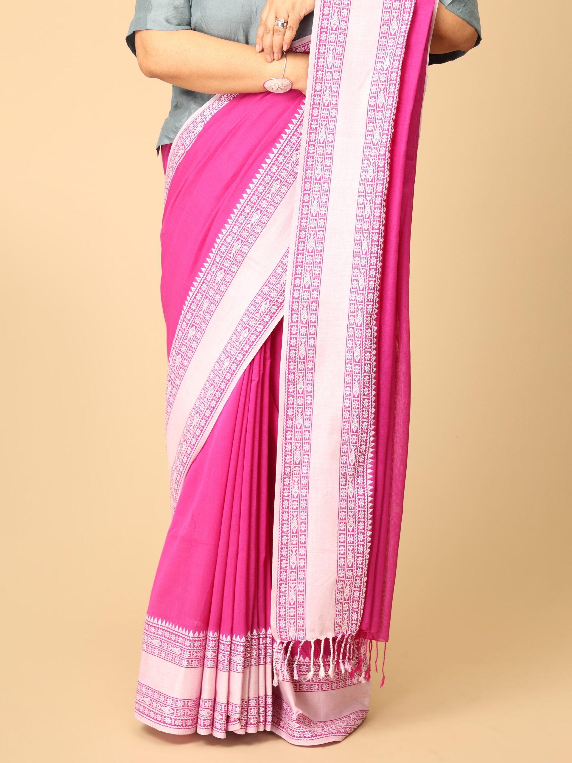 Bengal Cotton Saree in Pink and white with broad handwoven border. Bengal Cotton is known for its soft texture and fine weave. These sarees typically feature simple yet elegant borders with woven motifs, often in contrasting colors, and are lightweight, making them ideal for everyday wear.