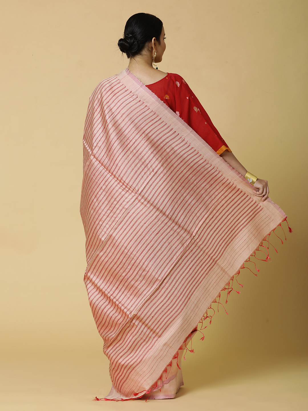 Pure plain Tussar Saree in Pink, understated, chic with minimal triangle motif on the pallu. The richness of the silk shines through this elegant piece.