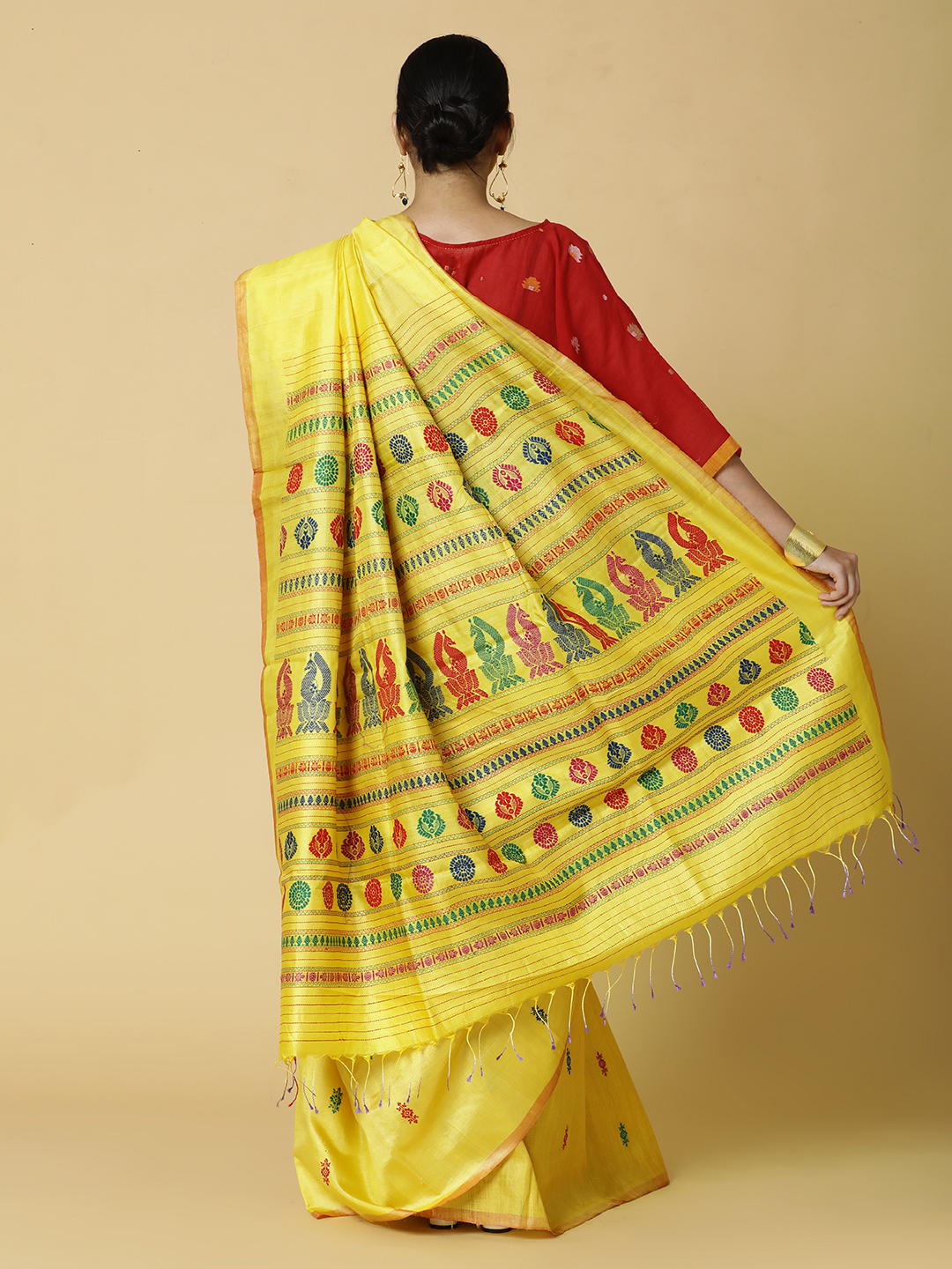 Bright sunshine yellow pure tussar silk saree with orange border with beautiful woven details on the pallu.