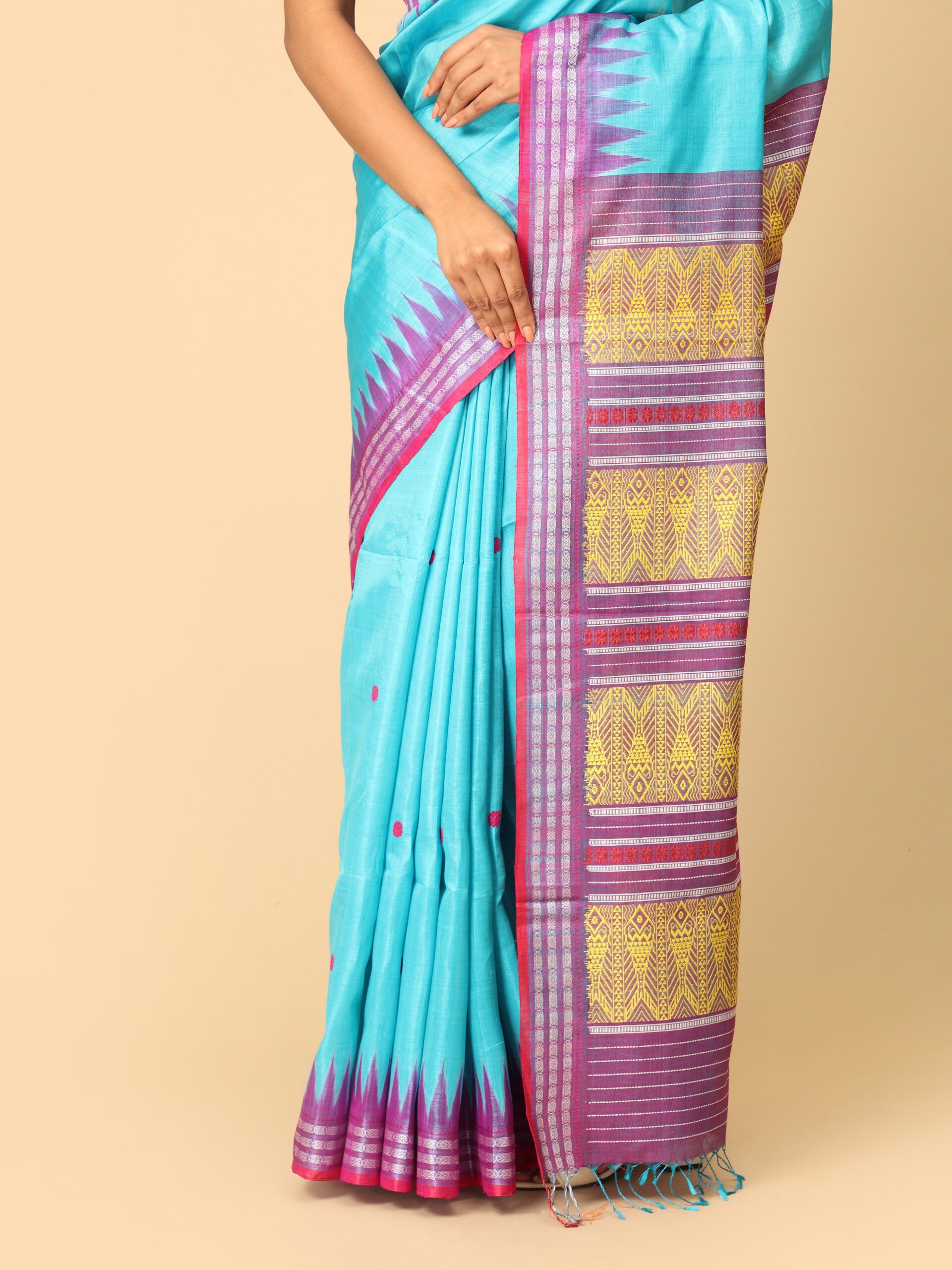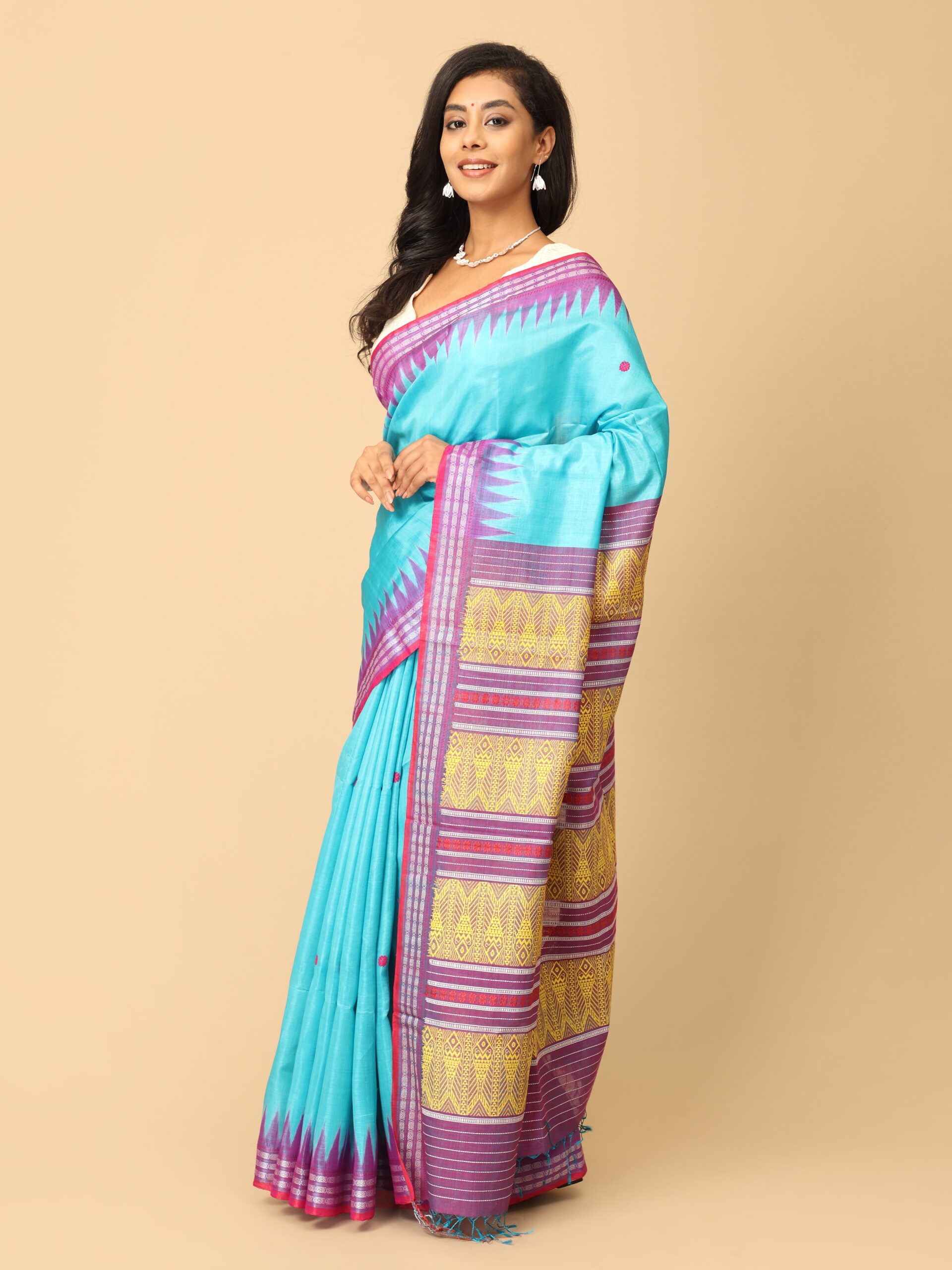 Gopalpur Natural Handspun Fine Tussar in contrasting colours of Surf Blue and pink with handwoven jaal style pallu. Gopalpur Tussar sarees, a renowned craft from Gopalpur in Odisha, have been awarded a Geographical Indication (GI) tag for their distinctive craftsmanship and regional origin. The sarees are woven from tussar silk, known for its natural golden hue and textured finish, which sets them apart from other silk sarees.