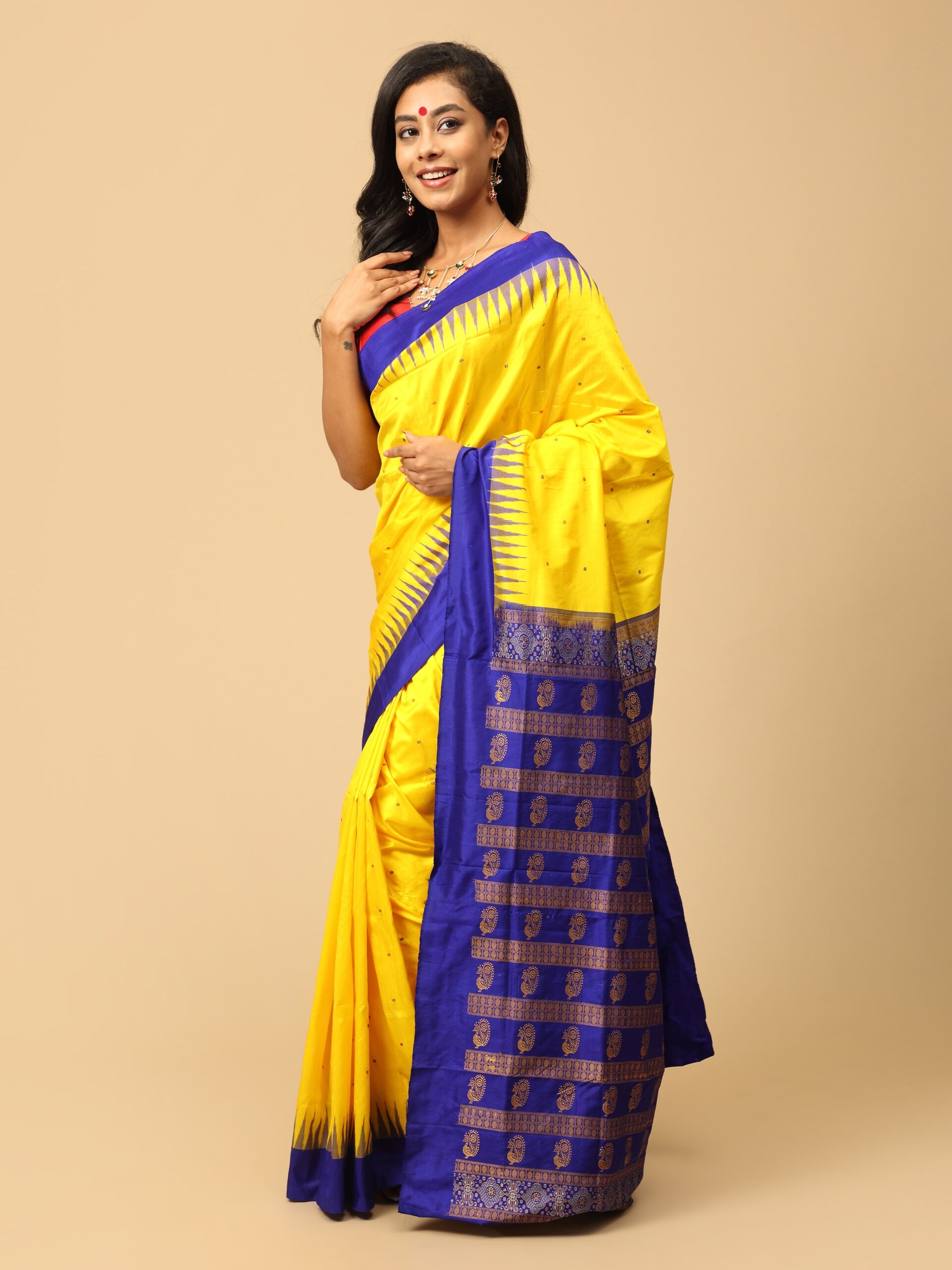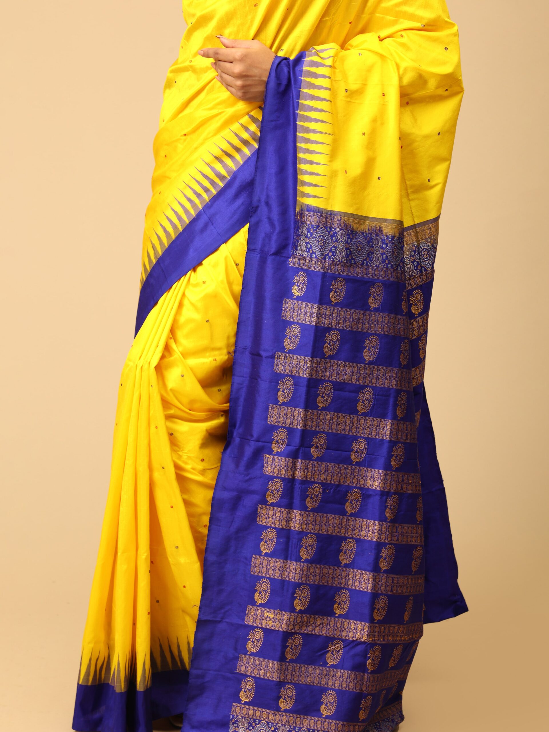 Yellow and Blue Sambalpuri Silk Saree with intricate handwoven pallu. With Blouse piece.The Sambalpuri saree, originating from the Sambalpur region of Odisha, is one of India’s most iconic traditional textiles.The Sambalpuri saree has been granted the Geographical Indication (GI) tag, which protects the authenticity of the saree and ensures it is made using traditional methods in the Sambalpur region.