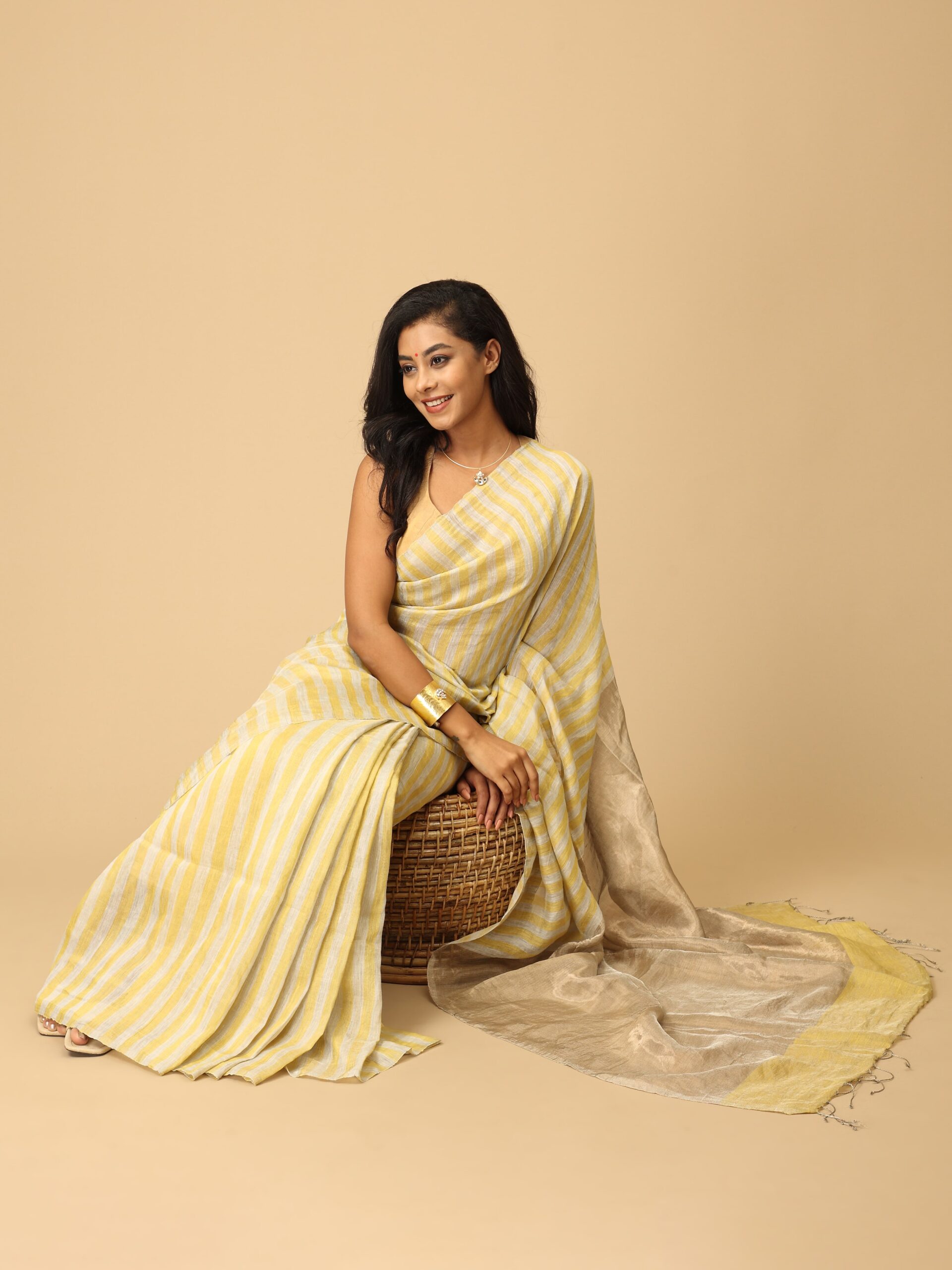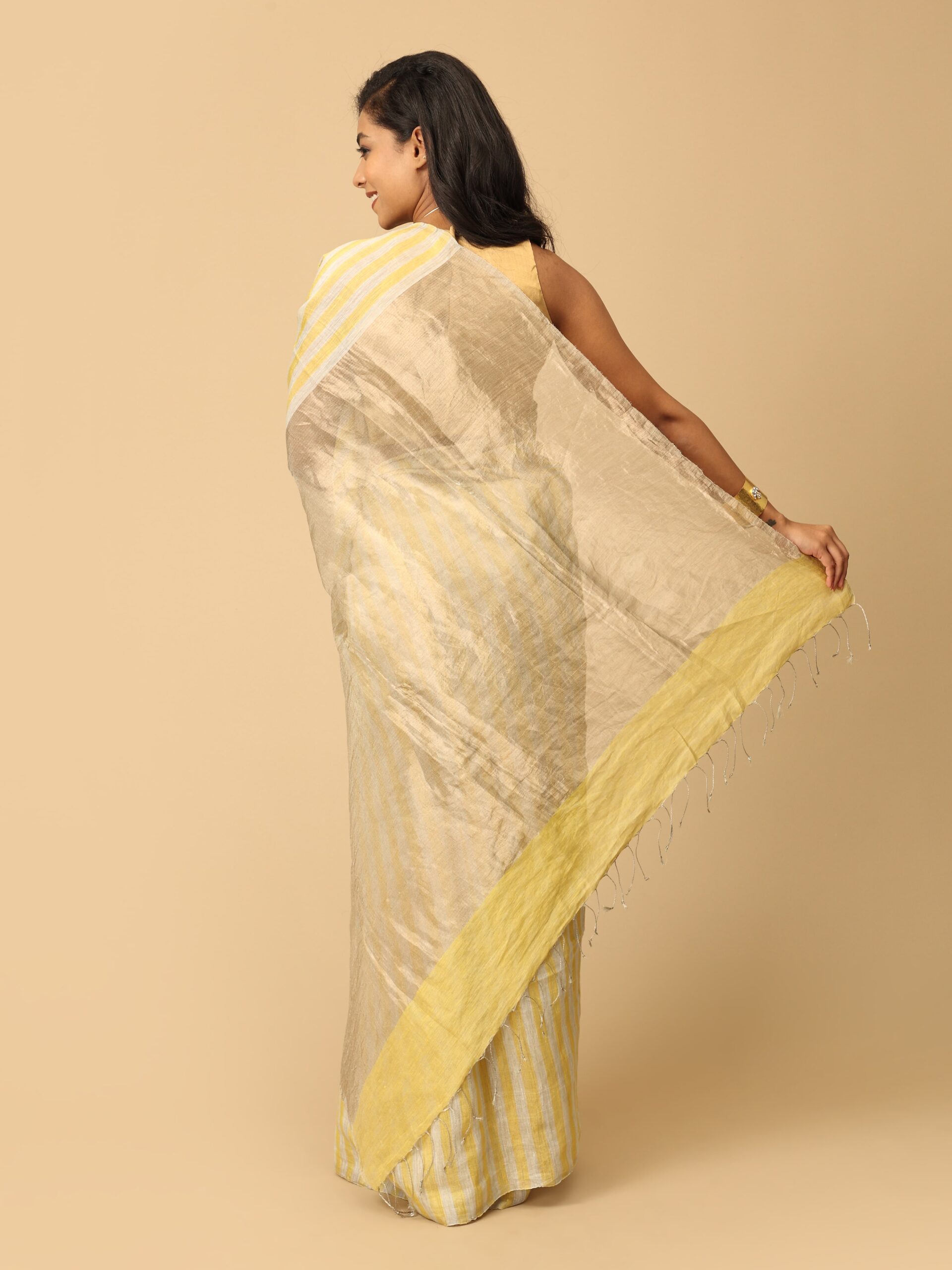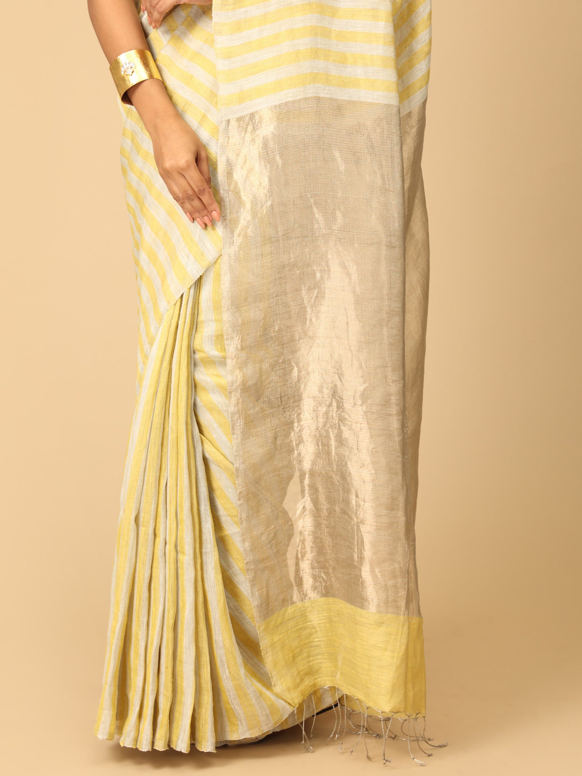 Linen and Zari Saree with stripes in yellow, white and gold. The lightweight linen fabric from West Bengal drapes gracefully, while intricate zari work, often in gold or silver, adds a touch of opulence with traditional motifs. These sarees are perfect for both festive occasions and casual wear