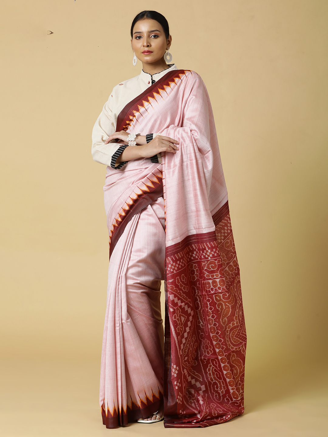 Light Pink Eri Silk With Maroon and Yellow Border